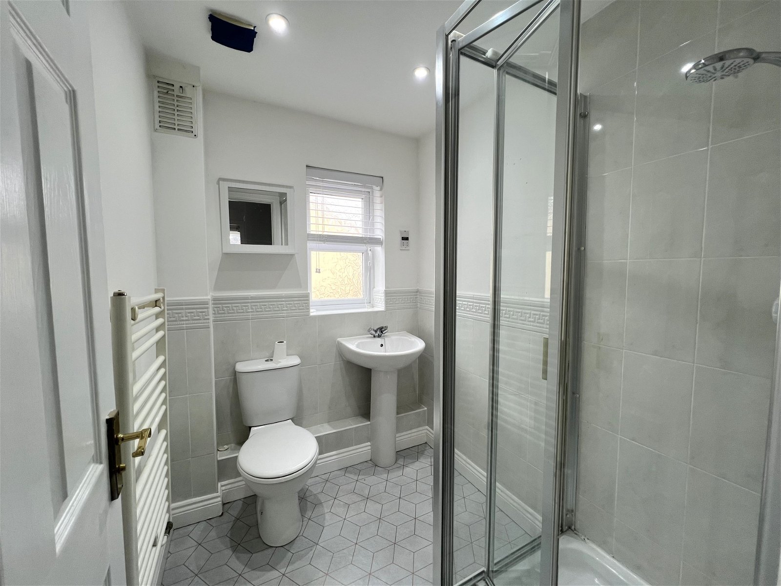 Featuring a three -piece suite finished in white comprising a step-in shower, a pedestal wash hand basin and a low flush W.C. The room has partial tiling to the walls, spot lights to the ceiling, an obscure front facing double glazed window, an extraction unit and a towel radiator.