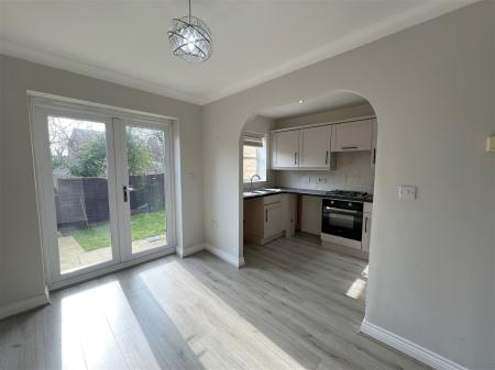 Having French doors opening directly into the rear garden, a useful under stairs storage cupboard and a central heating radiator. There is ample space for a family dining table and open plan access via an arch is offered to the kitchen.