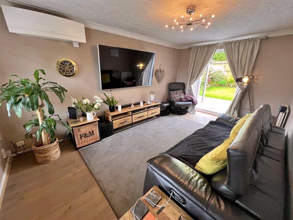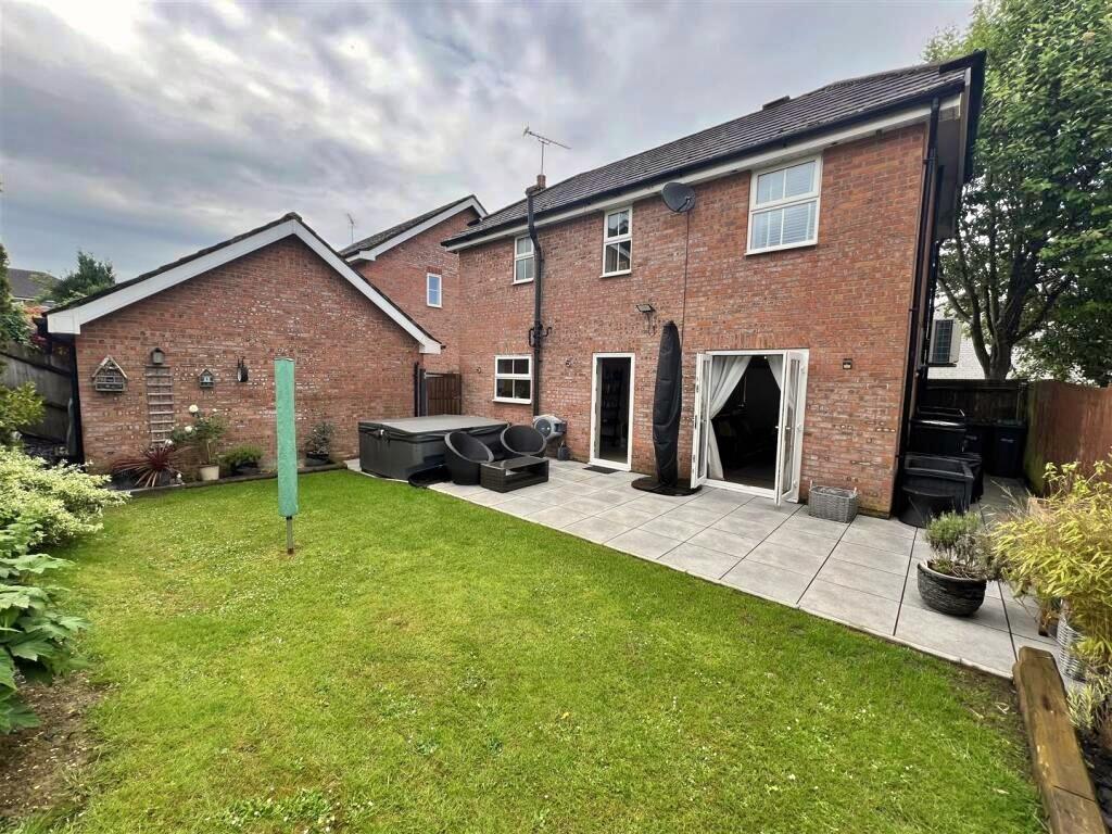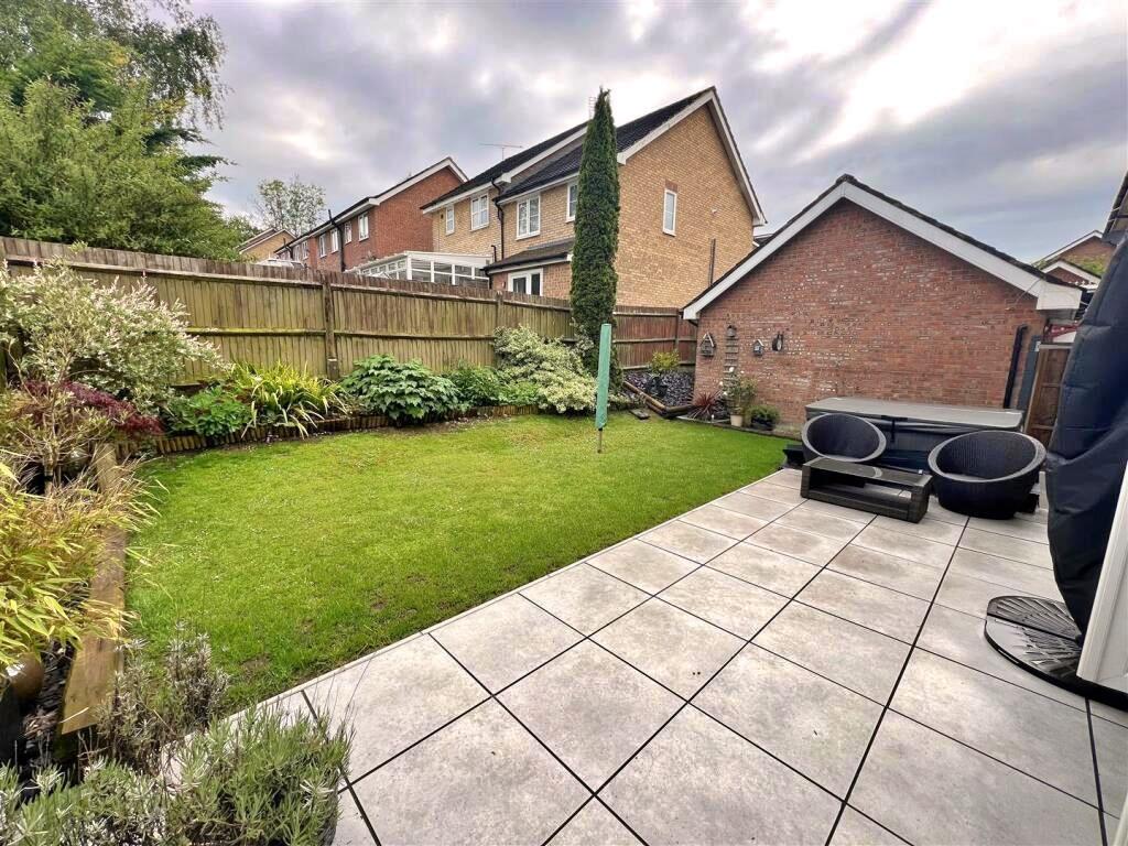 Outside, the property benefits from three off-street parking spaces and a single garage with power and light. The rear garden includes a large patio area, a hot tub, and a lawn with well-planted flower borders.