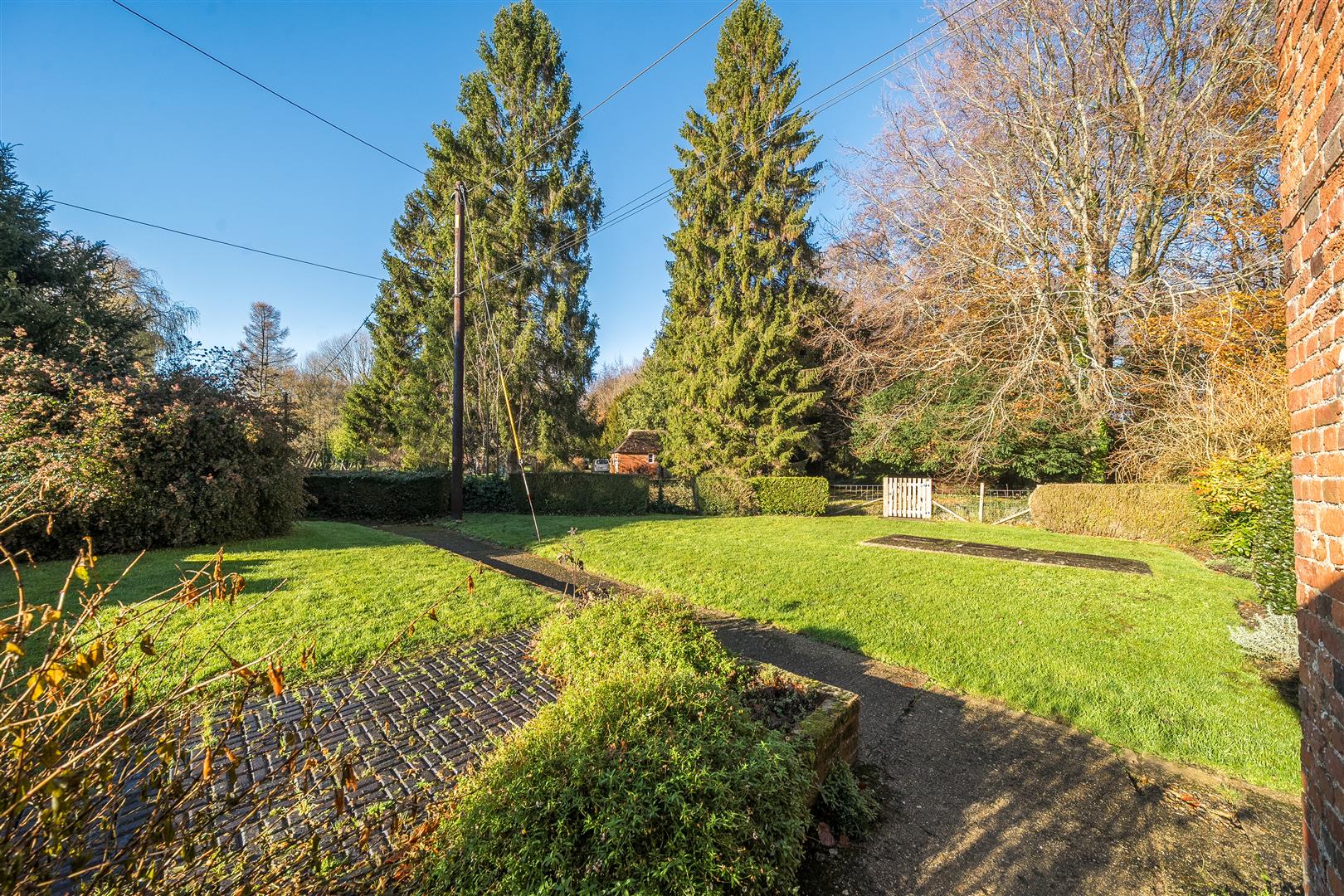 Outside, the property includes a gravel driveway that branches off from the main private estate road. This driveway leads around the surrounding river to a gravel parking area with space for two cars, as well as two garages. The property can be accessed via the main gravel bridge at the front, as well as a wooden bridge from the parking area that leads to the rear, providing access to the main garden. The primary garden area consists mainly of lawn but also features a small patio area at the back. Additionally, there is a small brick shed offering enough space for routine garden tools.