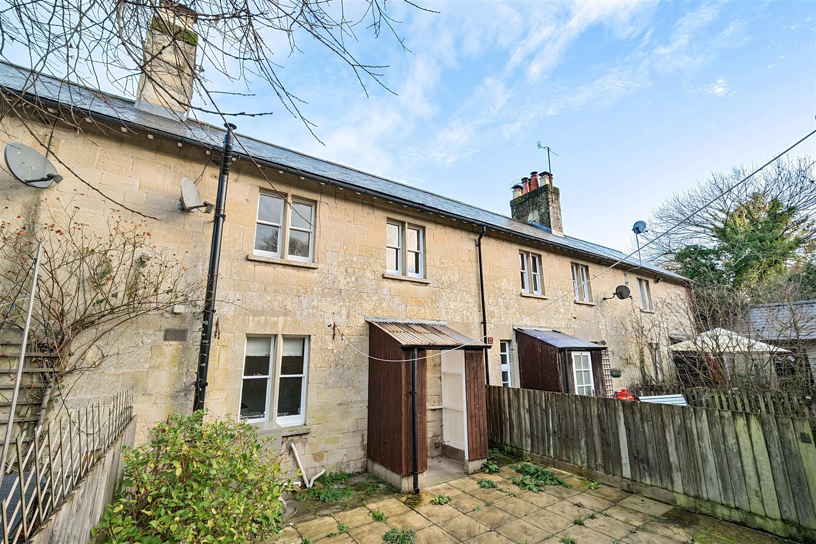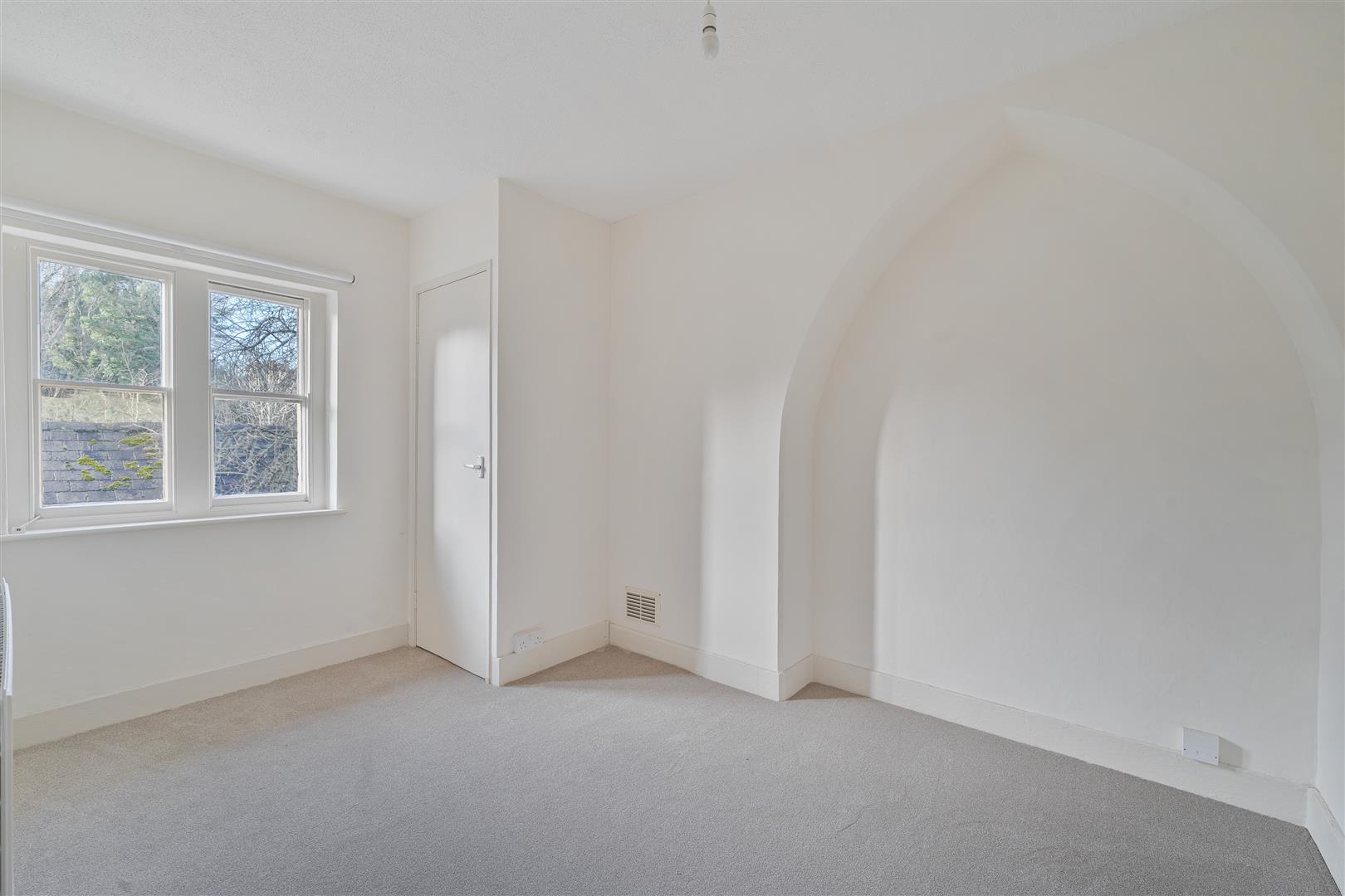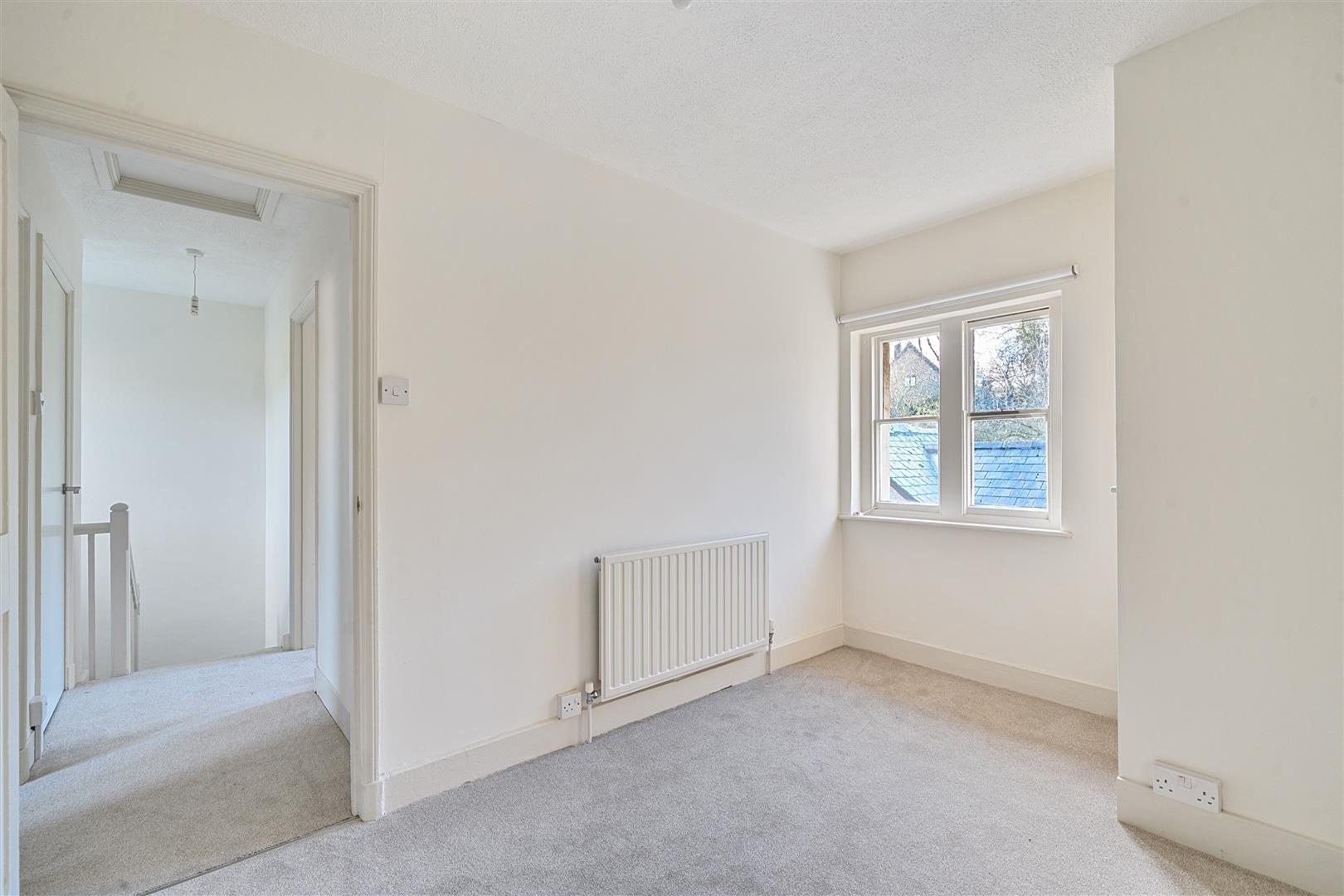 At the back, there is a courtyard with a brick-built storage shed. The front garden is open plan, and there is also a separate lawned area accessible by crossing a neighbouring property. The house is offered unfurnished