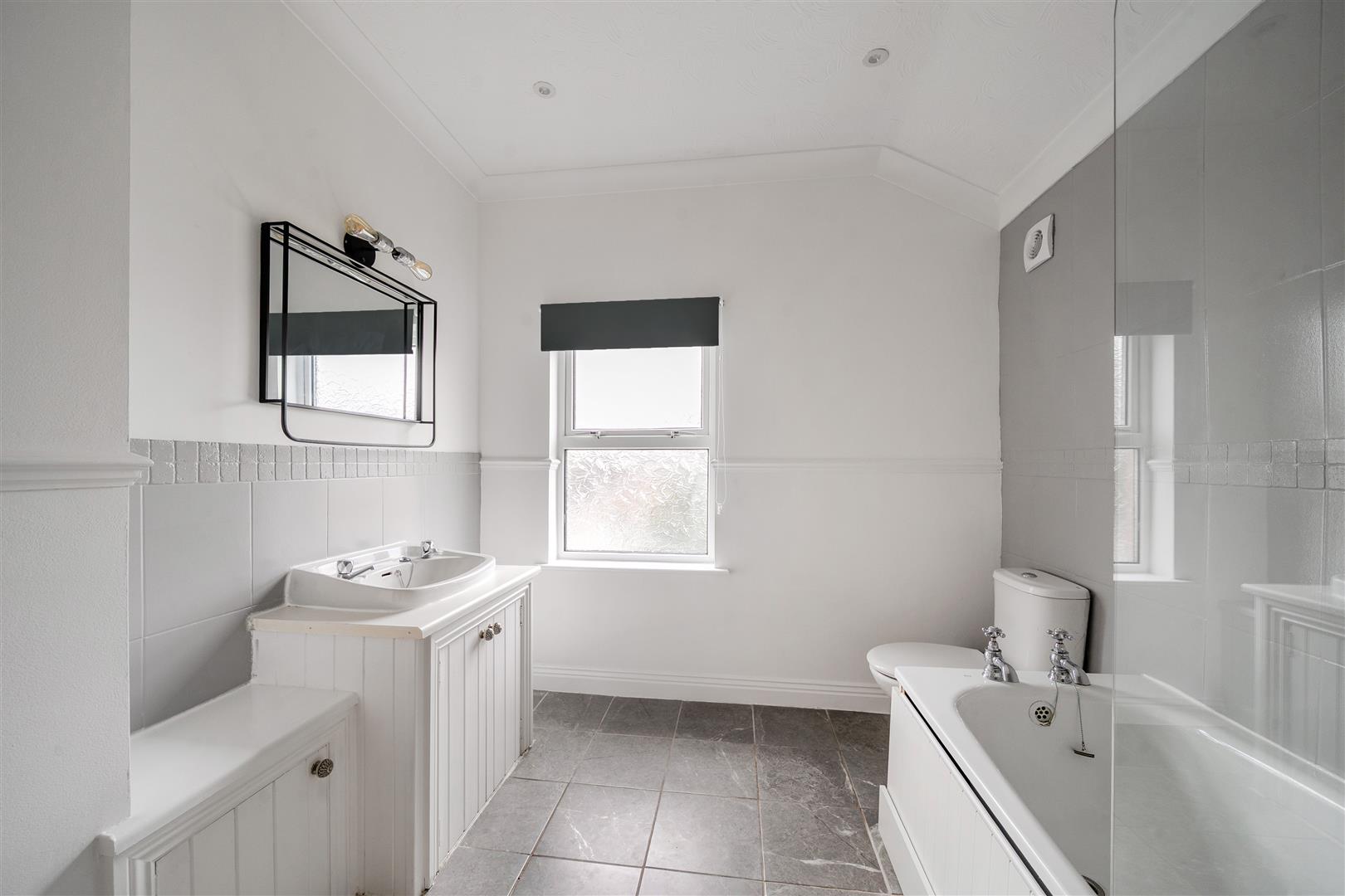 - Large bathroom with shower over bath and storage cupboard.