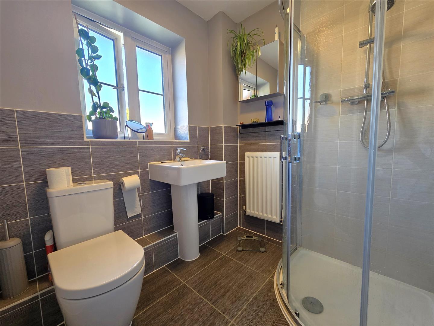 Modern en-suite shower room comprising three piece white suite & attractive wall tiling