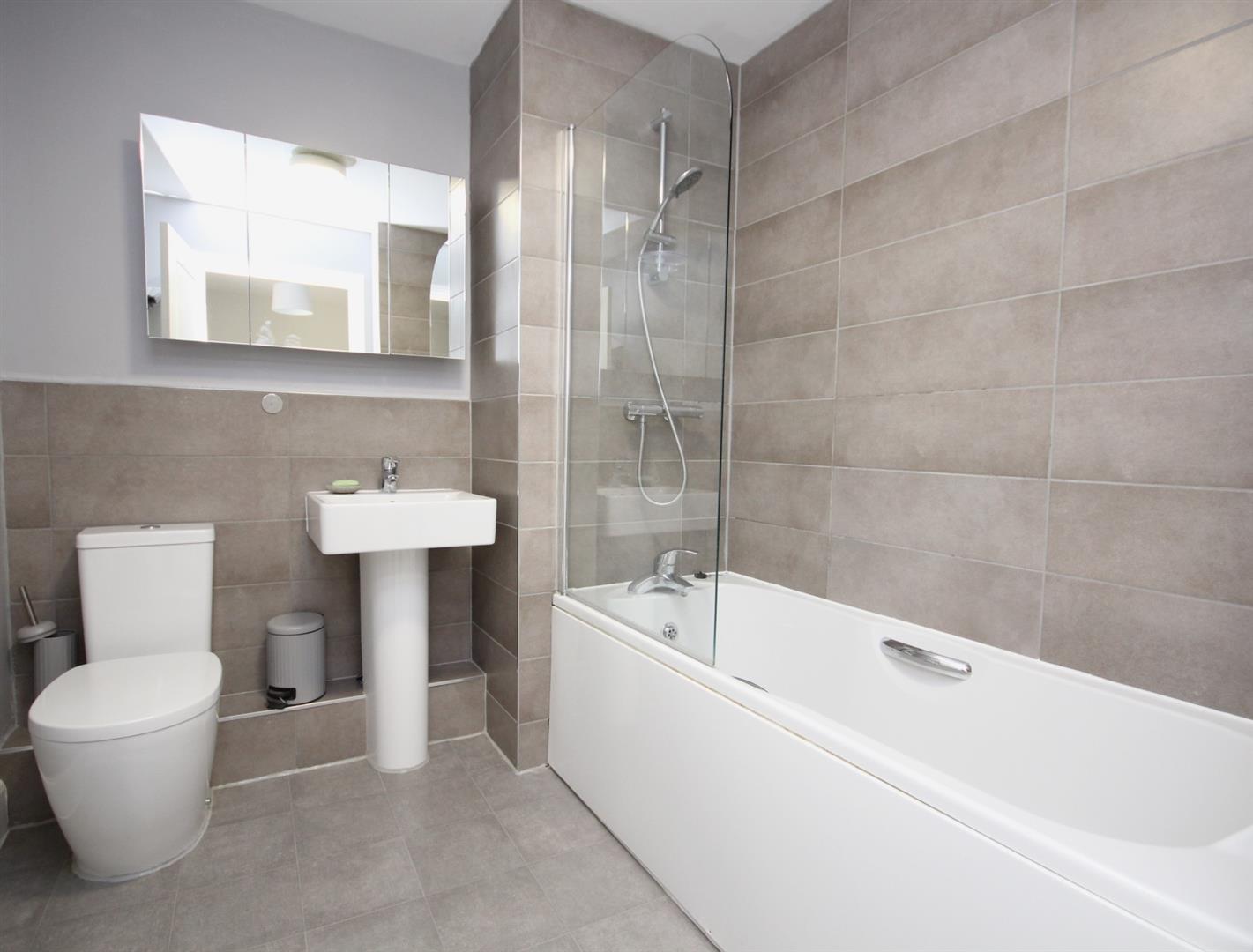 Modern main bathroom comprising three piece white suite & attractive wall tiling