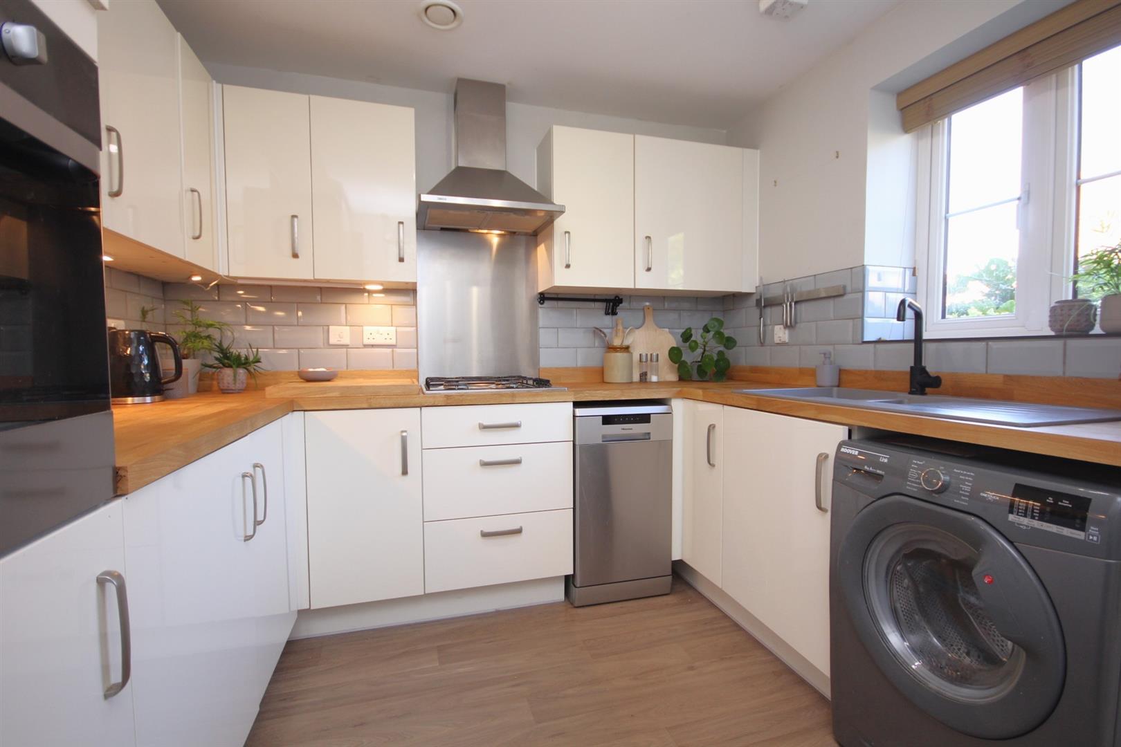 Modern re-fitted kitchen with solid wood worktops, high gloss cabinets, integrated oven/hob with space for additional appliances