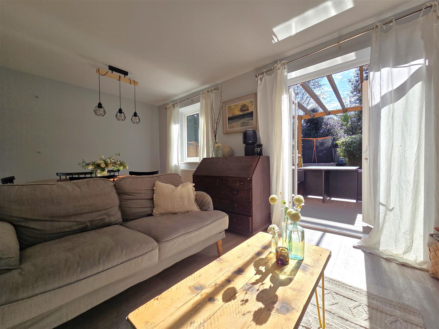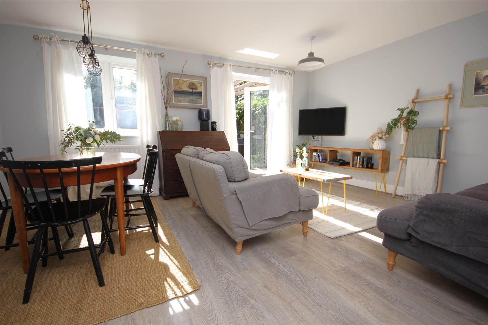 L shaped lounge/dining room with built in understairs storage cupboard & double doors opening out to the rear garden