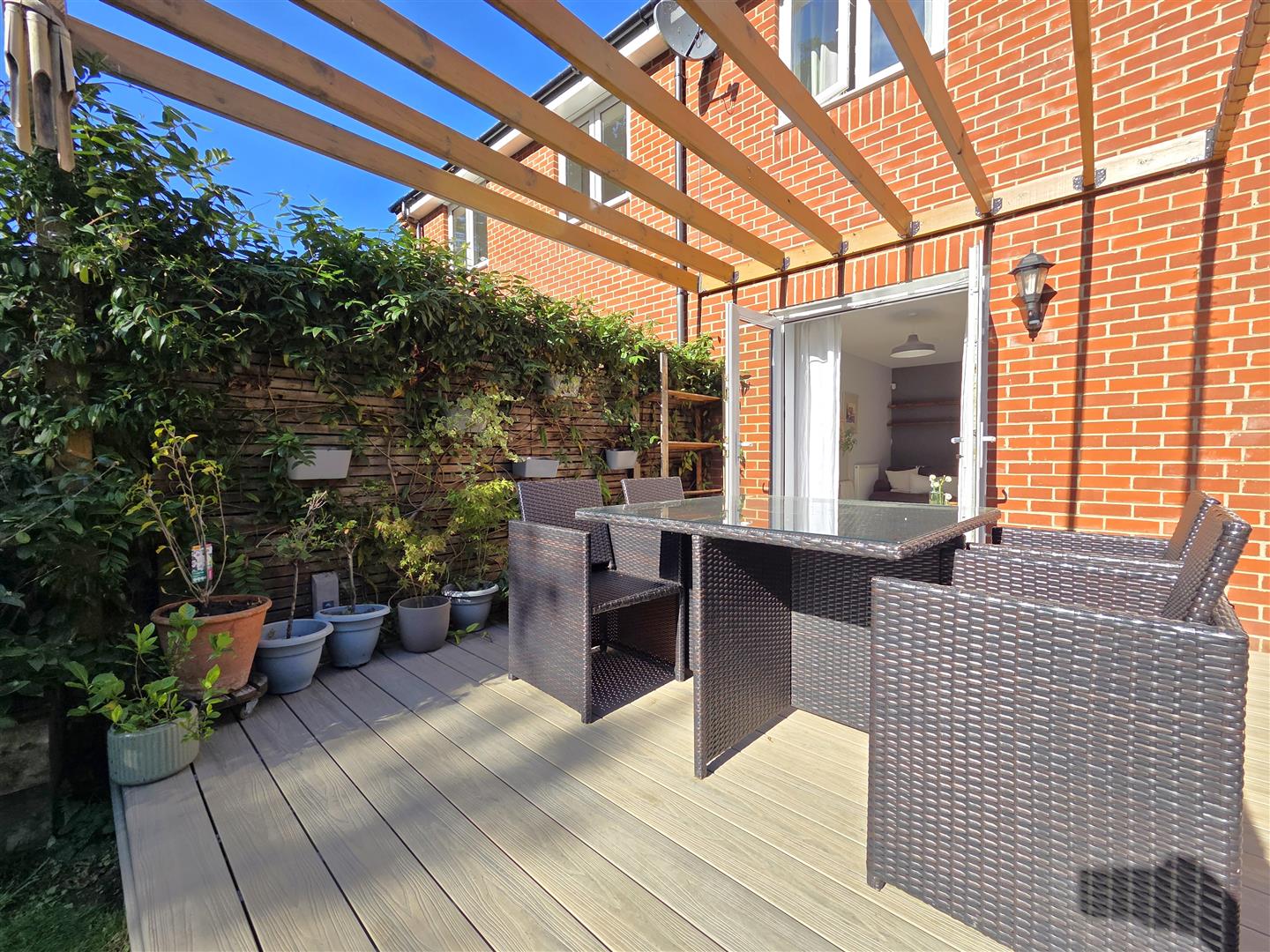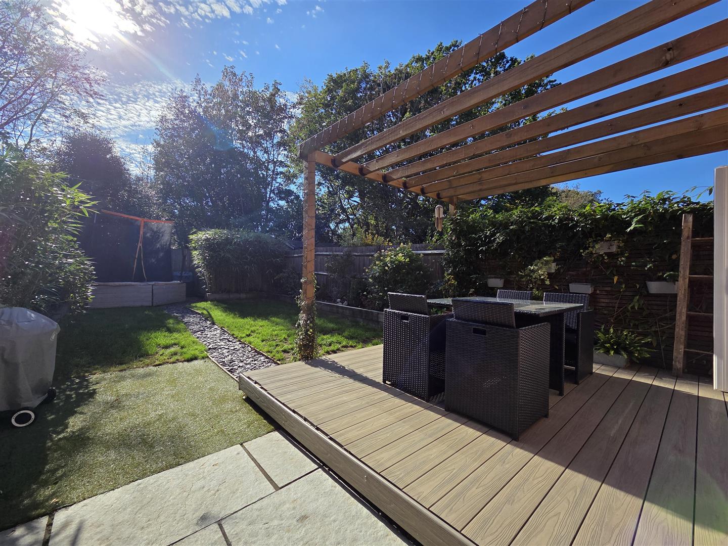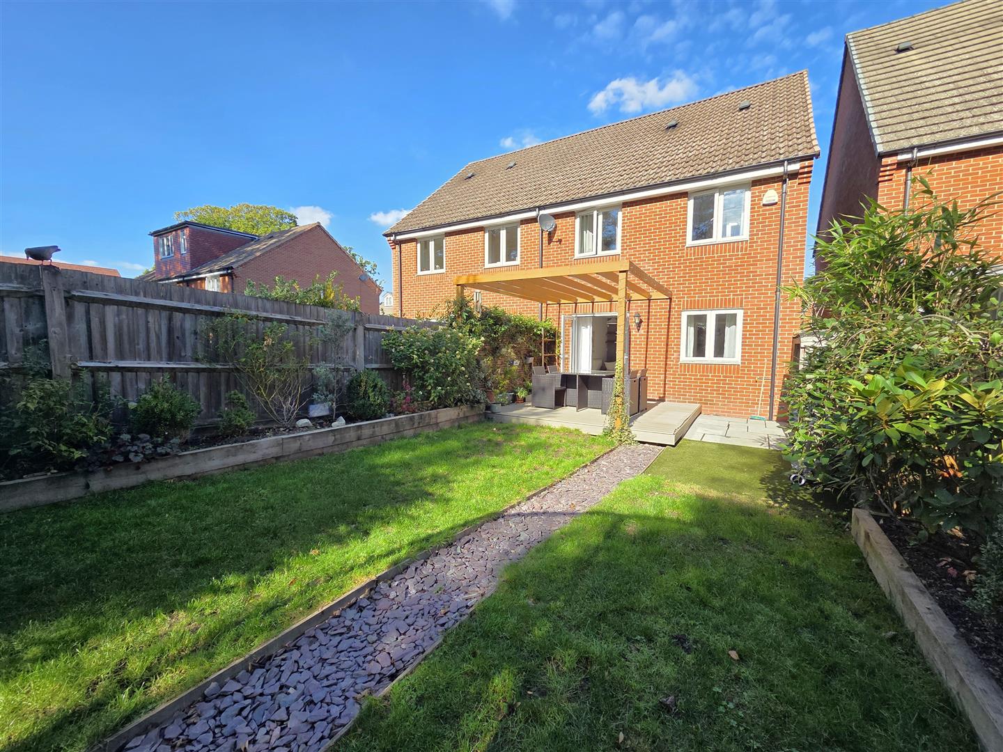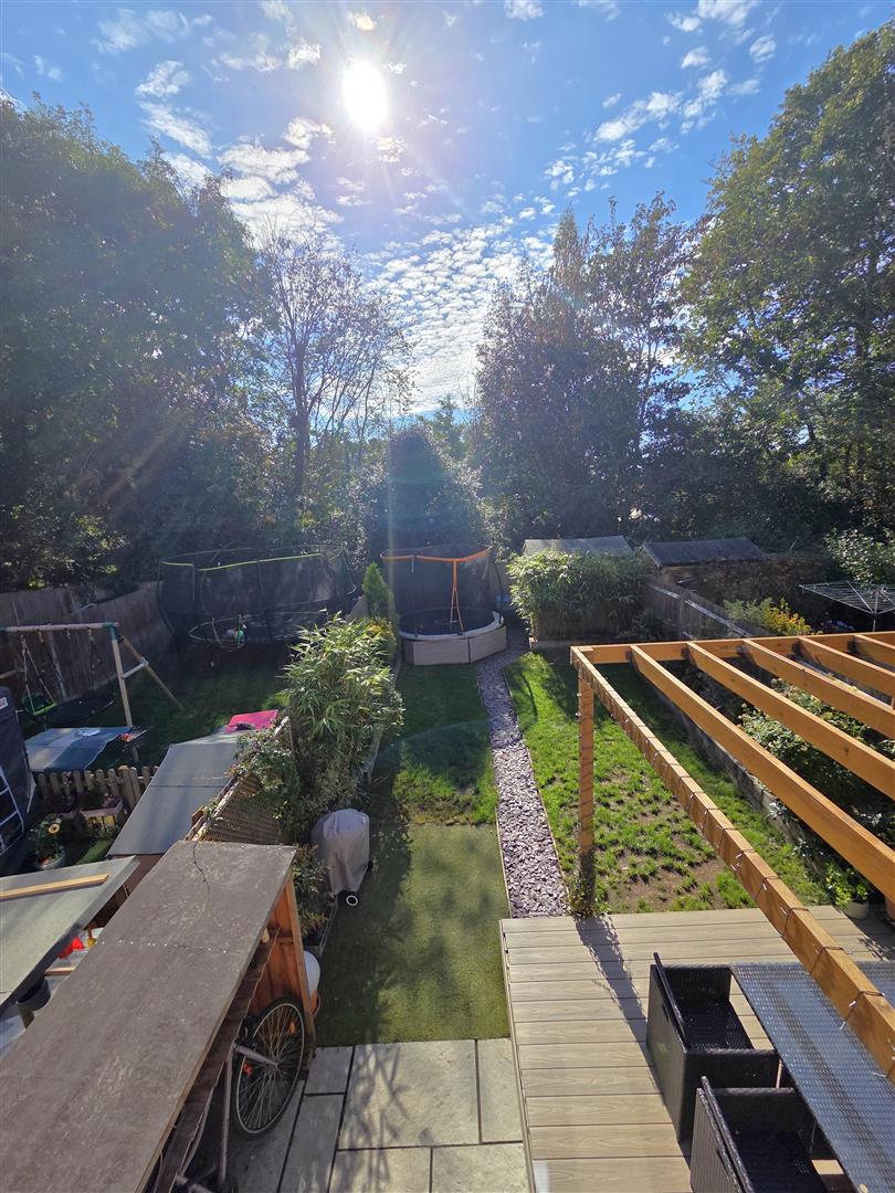 Beautifully landscaped southerly facing rear garden enjoying composite decked sun terrace with pergola above, area laid to lawn with raised sleeper beds enjoying display flower/shrubbery, shed to remain & side access