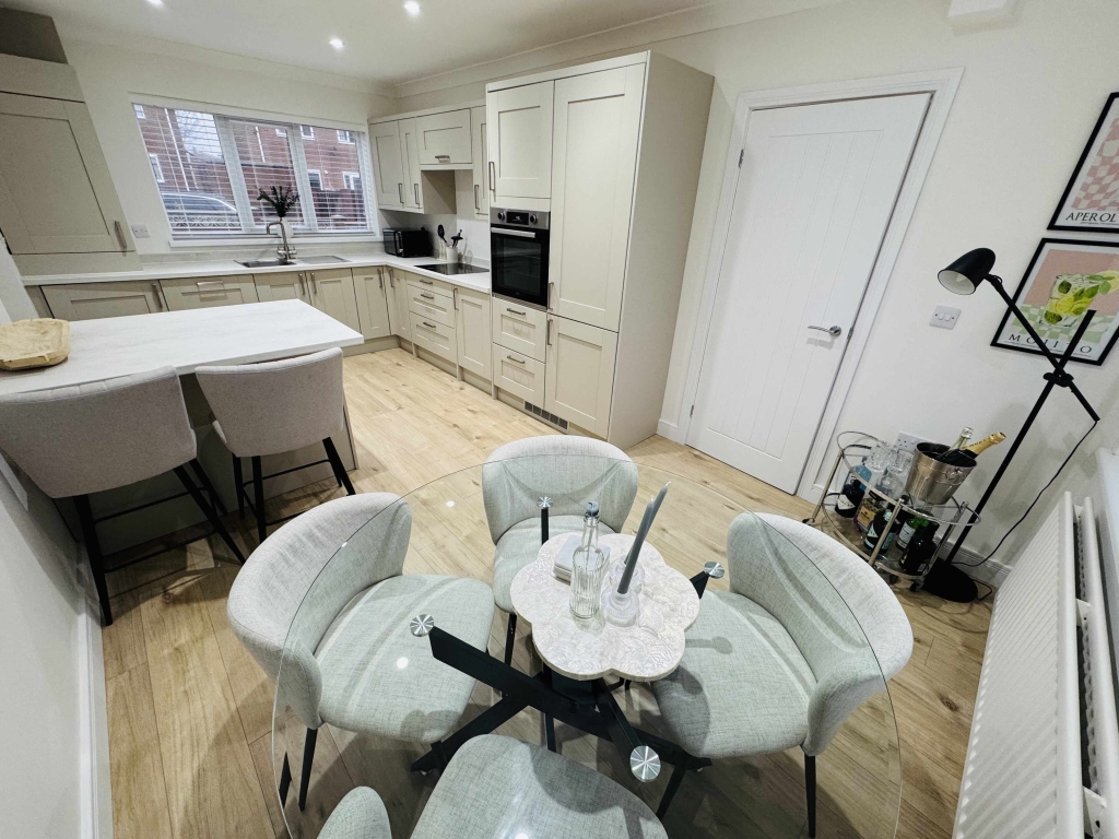 The interior has been meticulously updated to an executive standard, featuring fresh floor coverings throughout and a modern combi boiler system. Both bedrooms are generous doubles, while the refitted bathroom and contemporary kitchen-diner serve as the home's centerpiece. The kitchen is finished with stylish cabinetry and high-end integrated appliances, including a fridge freezer, washing machine, and dishwasher. Practicality is further enhanced by brick-built outbuildings, perfect for additional storage.