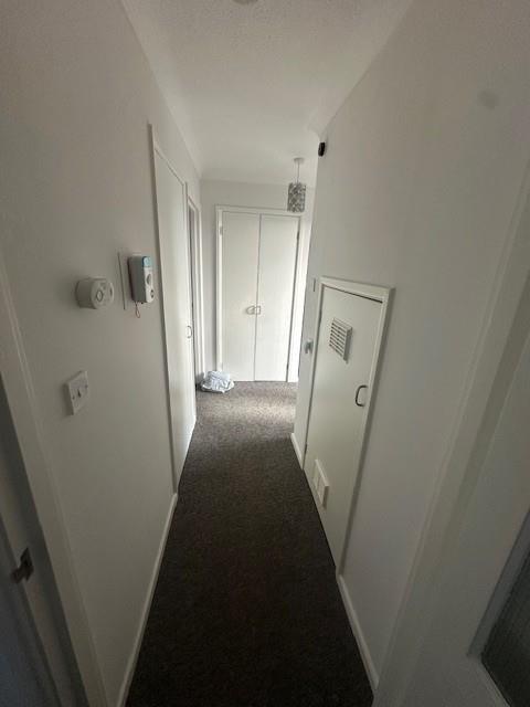 Hallway - Fitted carpet. Cream walls. White paintwork and ceiling. Pendant light fitting with shade. Emergency pull cord. Three storage cupboards one housing the boiler.