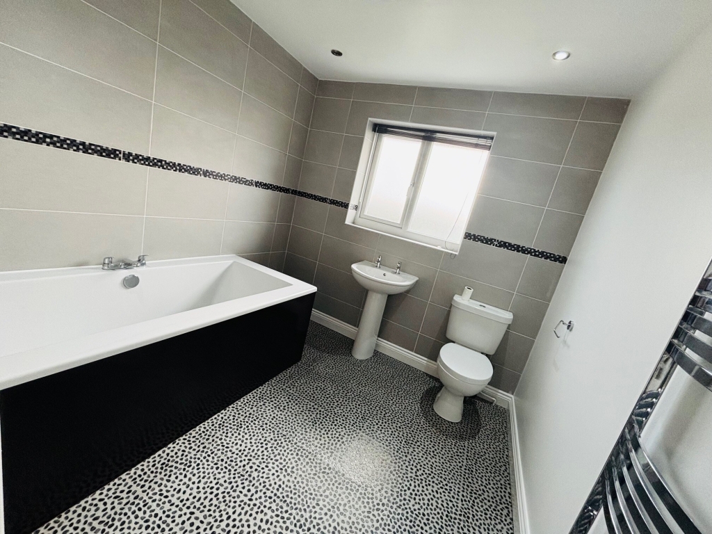 - Stylish first-floor family bathroom with oversized bath, tiled walls, linoleum flooring, and chrome ladder radiator