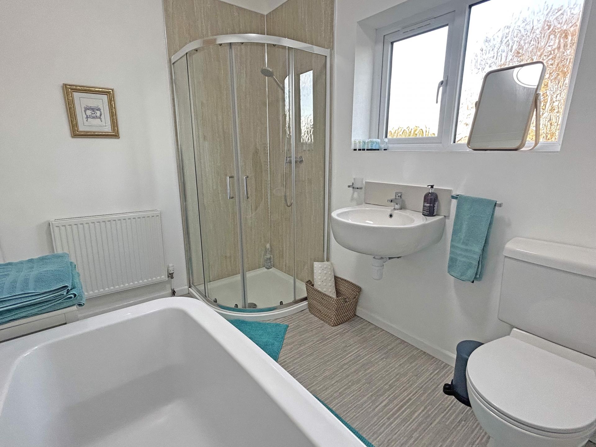 uPVC obscured double glazed window. White suite comprising panelled bath, WC, wall hung wash basin, Quadrant shower cubicle with internal wall panelling. Bristan shower with riser and rose. Lino flooring. Radiator and heated towel rail. Ceiling extractor.