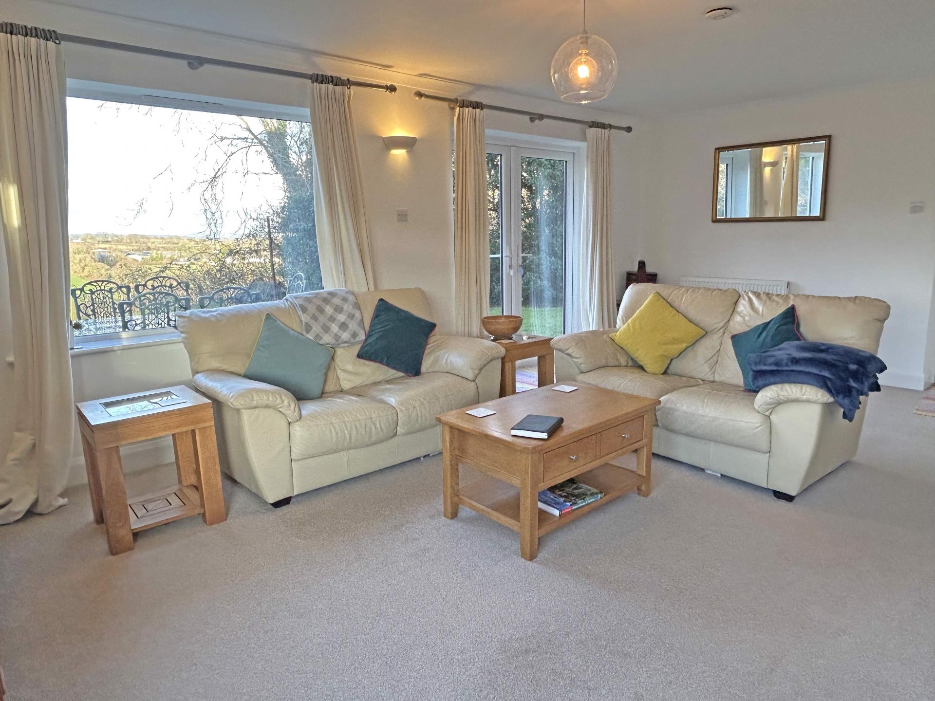 L shaped 6.15m (20’02) x 3.49m (11’05) uPVC double glazed window and French doors giving access to the patio and garden, enjoying a pleasant outlook to countryside. Radiator. Curtains. Wall lights. Carpet.