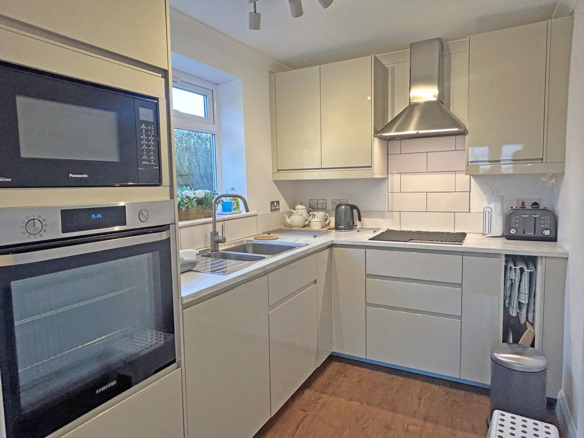 2.85m (9’04) x 1.98m (6’6) uPVC double glazed window. Modern fitted kitchen comprising a range of floor and wall mounted cupboards with high gloss door and drawer fronts. Marble effect worksurfaces with tiled splashbacks. One and a half bowl stainless steel sink incorporating drainer. Electric induction hob. Stainless steel cooker hood over. Built-in electric single oven and microwave. Integrated dishwasher. Wood effect flooring. Radiator.