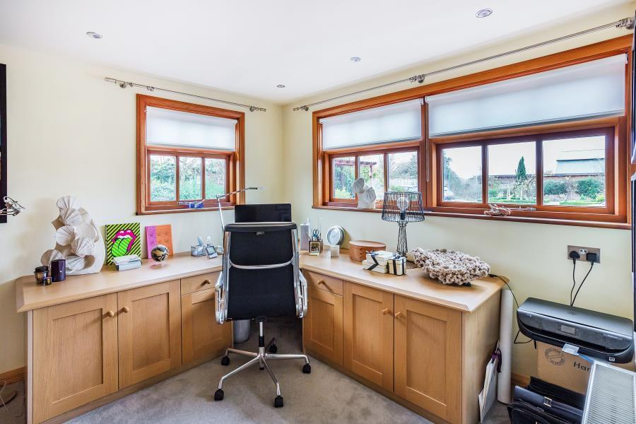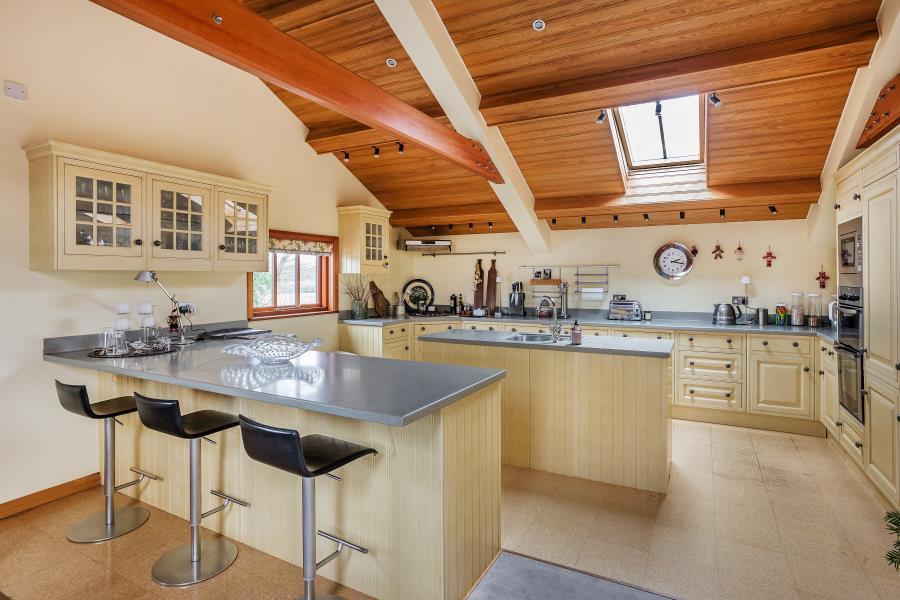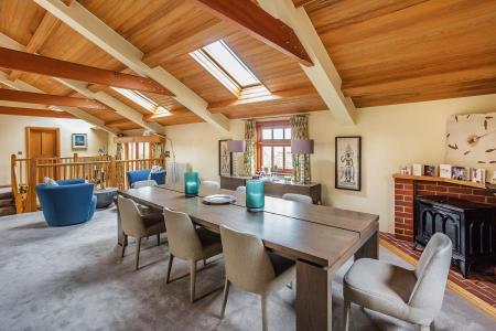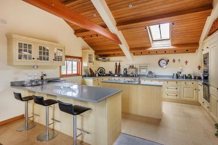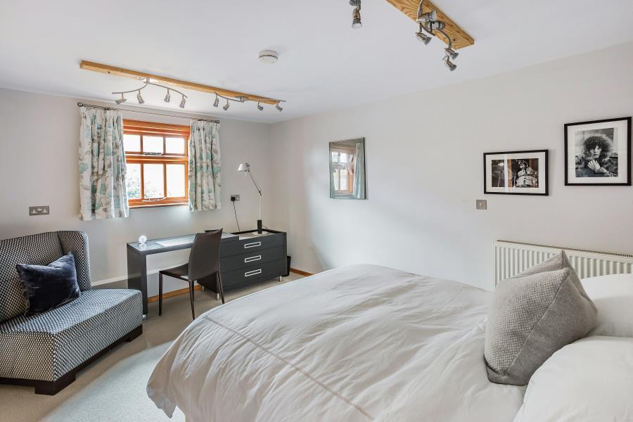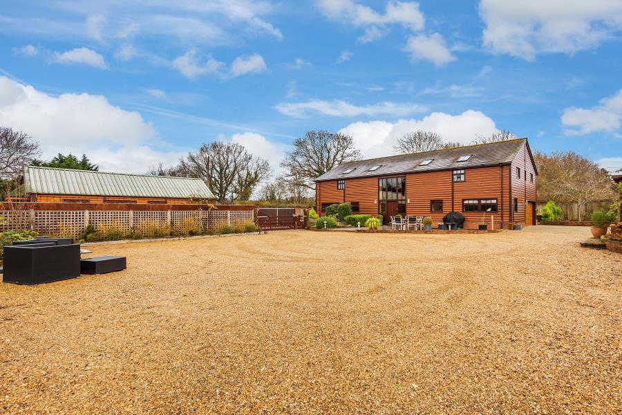 UNFURNISHED. A truly unique timber framed barn which provides exceptional accommodation arranged over two floors. The top floor offers spacious open plan living with a sitting room, dining room and fully fitted kitchen with breakfast bar. The master bedroom has 4.5 metres of fitted oak wardrobes together with an ensuite bathroom all overlooking panoramic views of the surroundng countryside. The second bedroom is currently fitted as a dressing room with an en suite shower. The ground floor is light and airy with a double height solar bronze glass atrium leading into the entrance hall and the galleried staircase rising to the first floor. Downstairs are a further two bedrooms and two ensuite bathrooms. There is a fully fitted utility room with a bespoke lime oaked study or bedroom 5. There is a double garage with electric door, a fitted laundry area and numerous storage cupboards. The Barn is approached through a five bar gate from the main gravel driveway. Generous landscaped gardens surrounding the property and ample parking. Excellent location with easy access to Guildford, Woking, A3 and M25. EPC rating D.