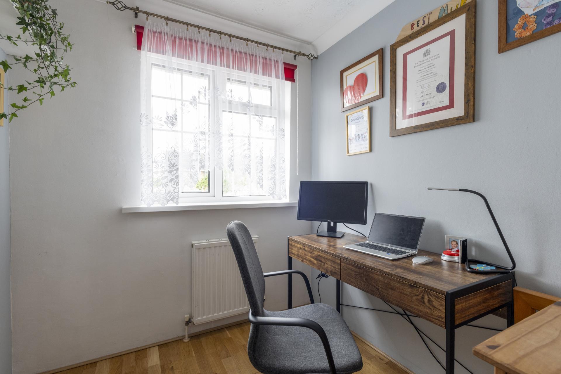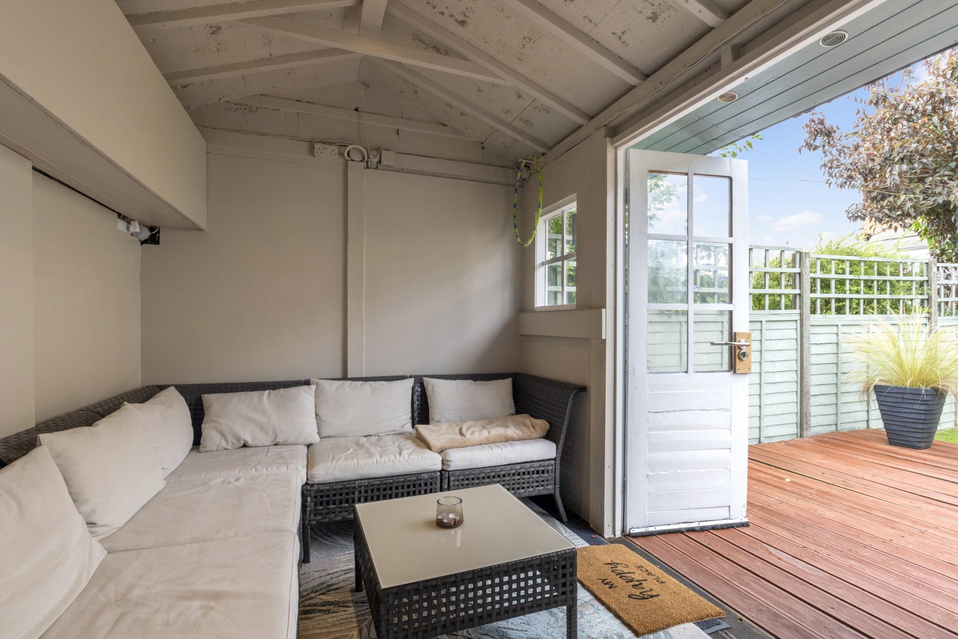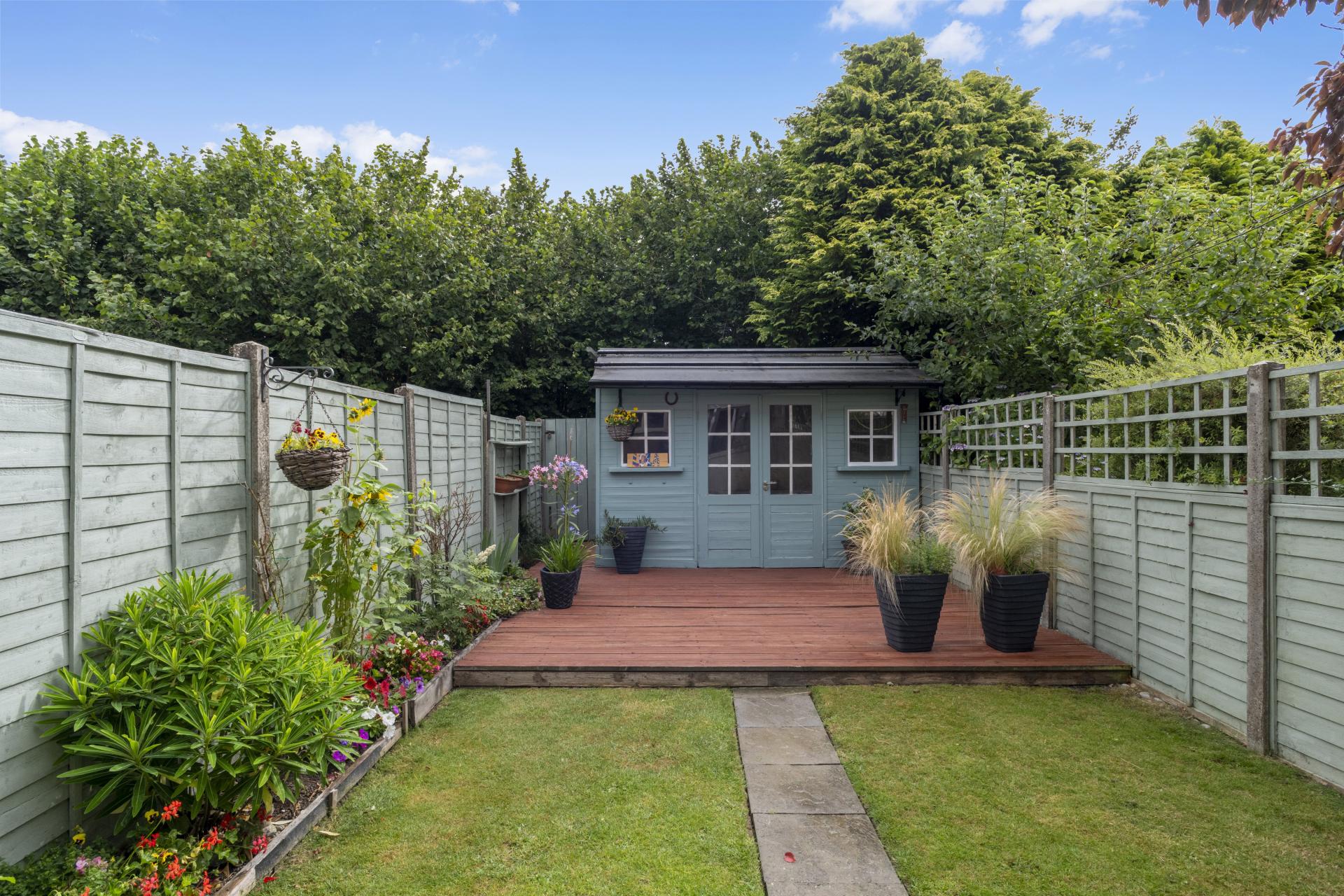 Upstairs, there are three bedrooms and a family bathroom with a shower over the bath. The enclosed rear garden, mainly laid to lawn with a patio area for seating, also includes a summerhouse.