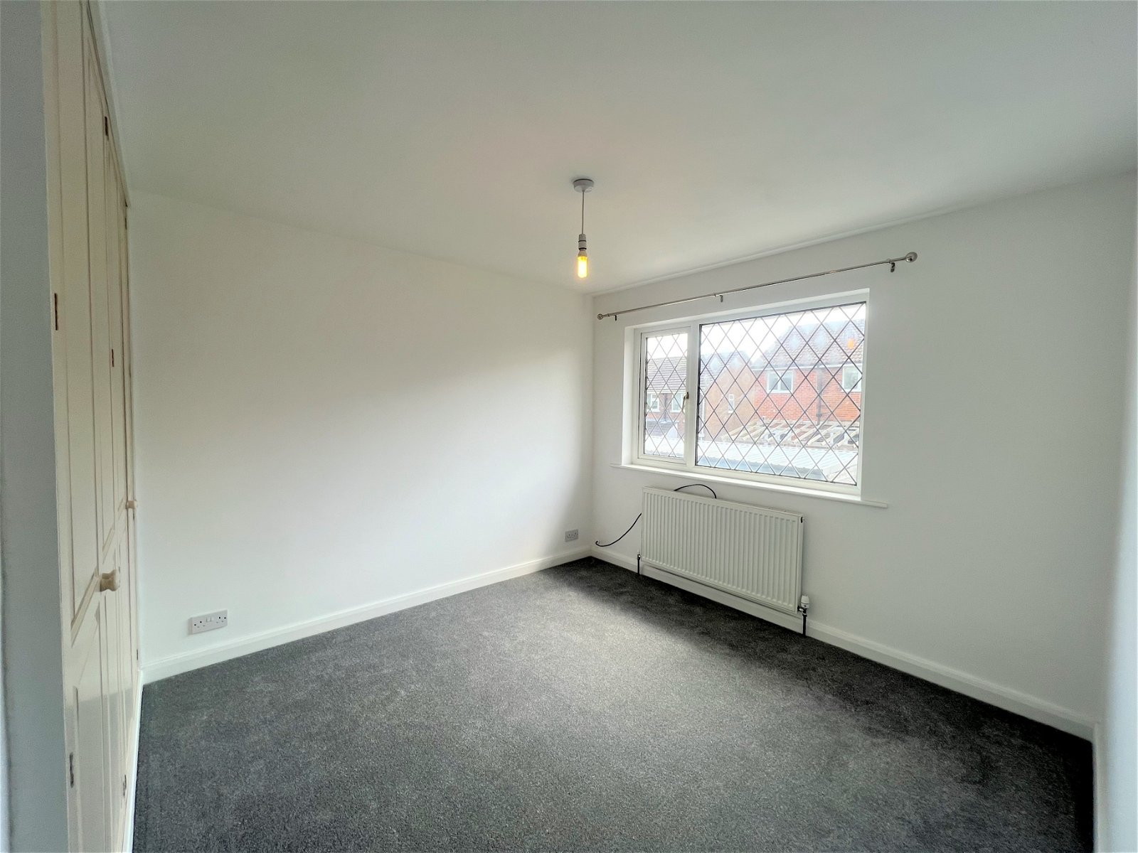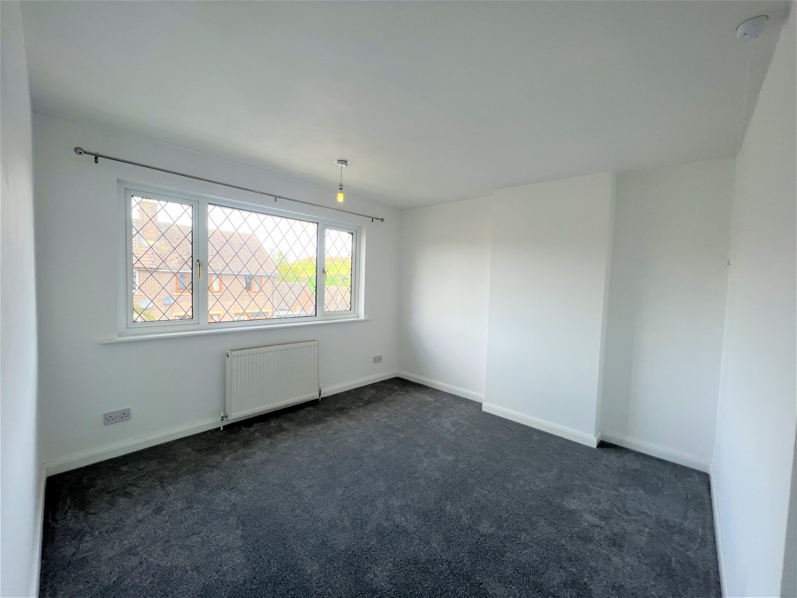 A generous rear facing double bedroom, benefitting from a range of fitted wardrobes and being newly decorated and having a new carpet. There is a double glazed window and a central heating radiator.