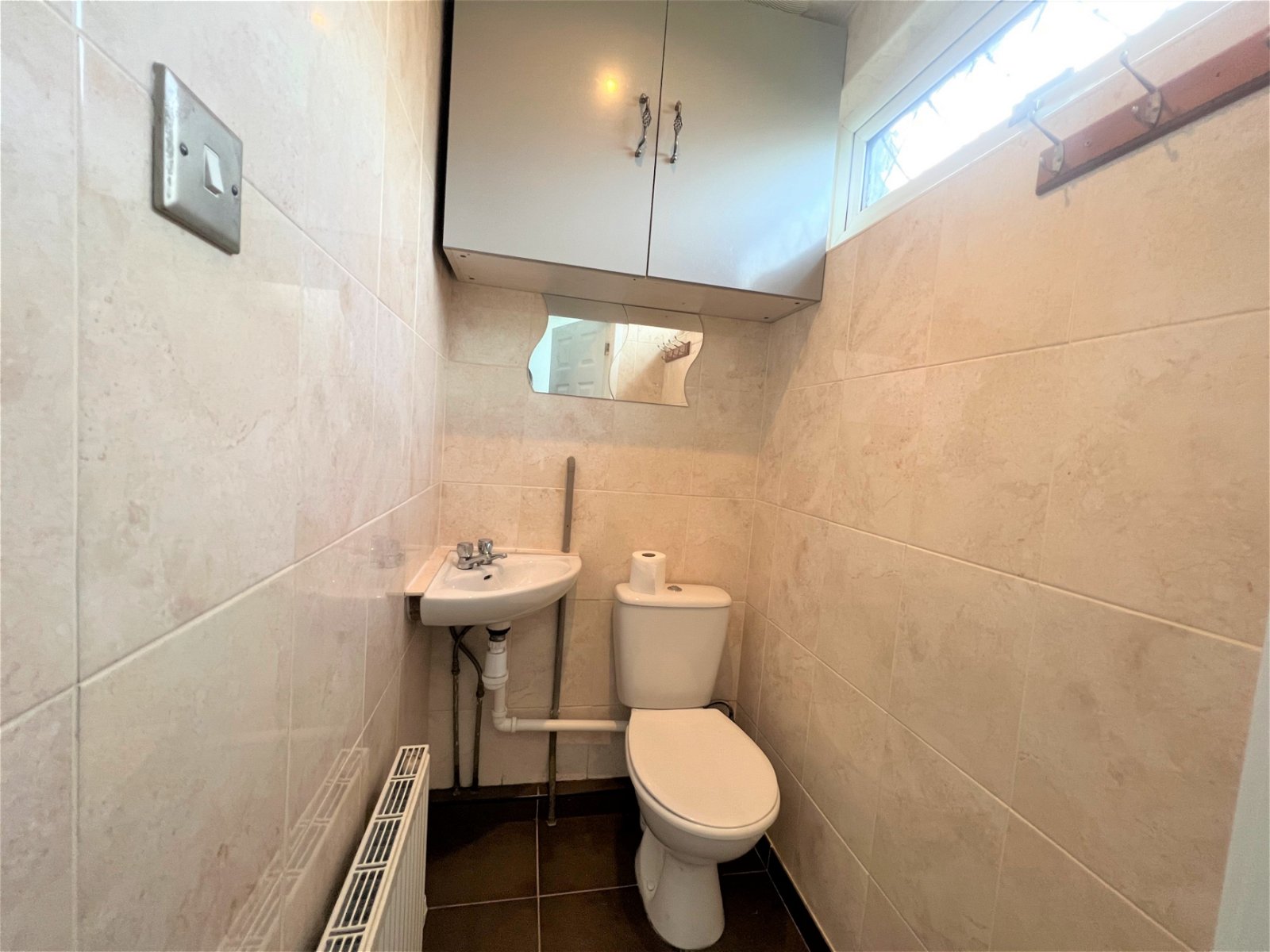 Featuring a two-piece suite finished in white, comprising a low flush W.C and a corner wash hand basin. There is a useful wall mounted storage cupboard, full tiling to the walls and floor, a front facing Obscure double glazed window, spot lights to the ceiling and a central heating radiator.
