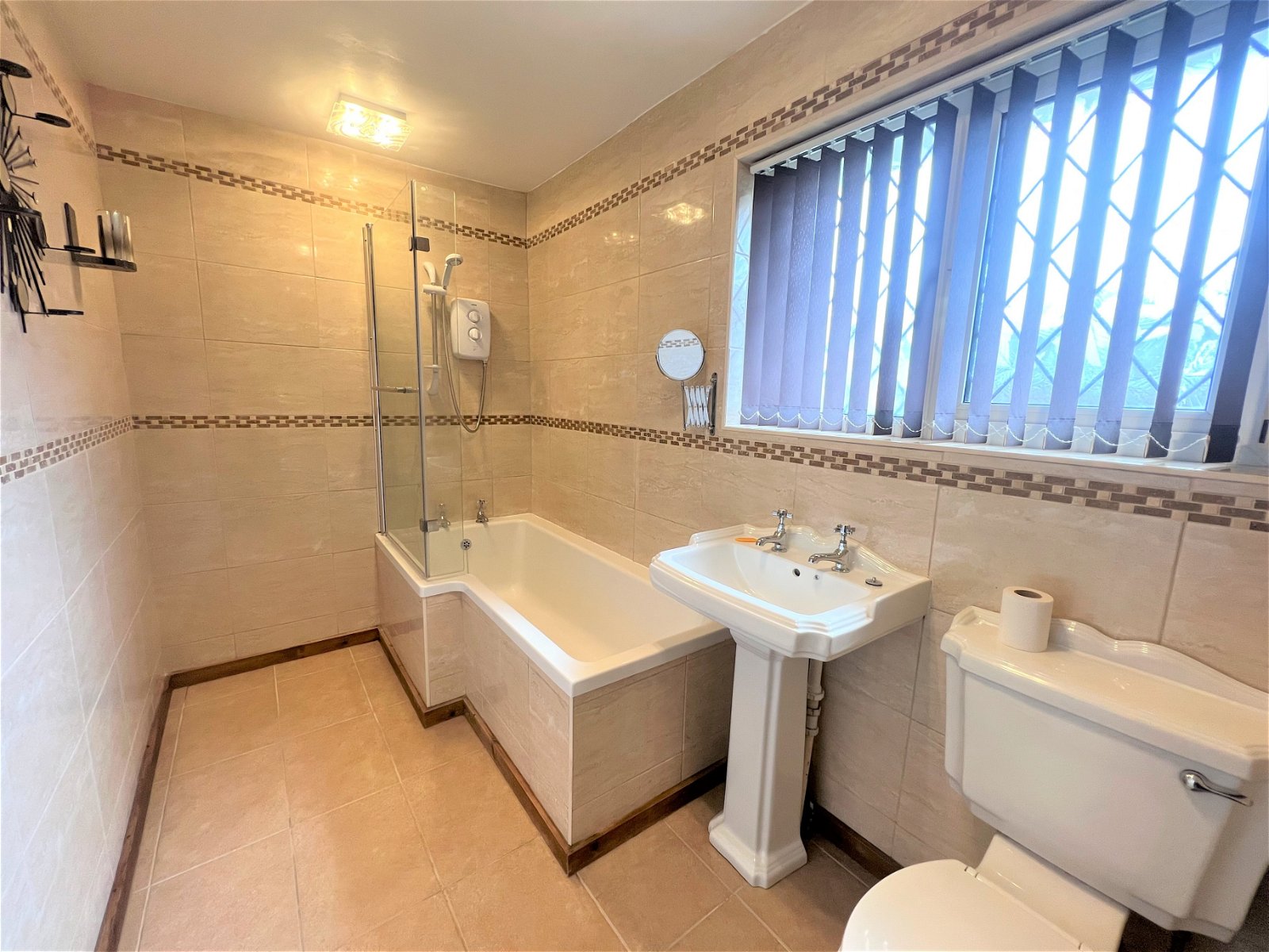 Featuring a three piece suite finished in white, comprising a tiled panel bath with a shower over and a fixed glass screen, a pedestal wash hand basin and a low flush W.C. There is a rear facing Obscure double glazed window, full tiling to the walls and floor and a chrome towel radiator.
