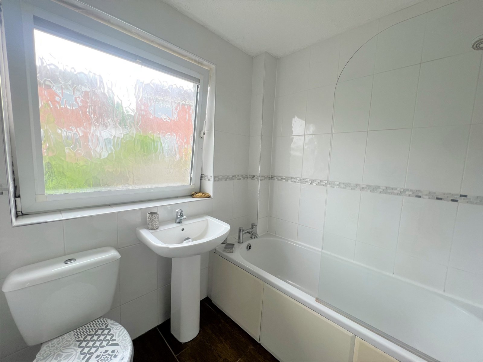 Featuring a three-piece suite finished in white, comprising a panelled bath with a shower over and a fixed glass screen, a low flush W.C and a pedestal wash hand basin. There is full tiling to the walls, a rear facing obscure double glazed window, a single spot light to the ceiling and a chrome towel radiator.