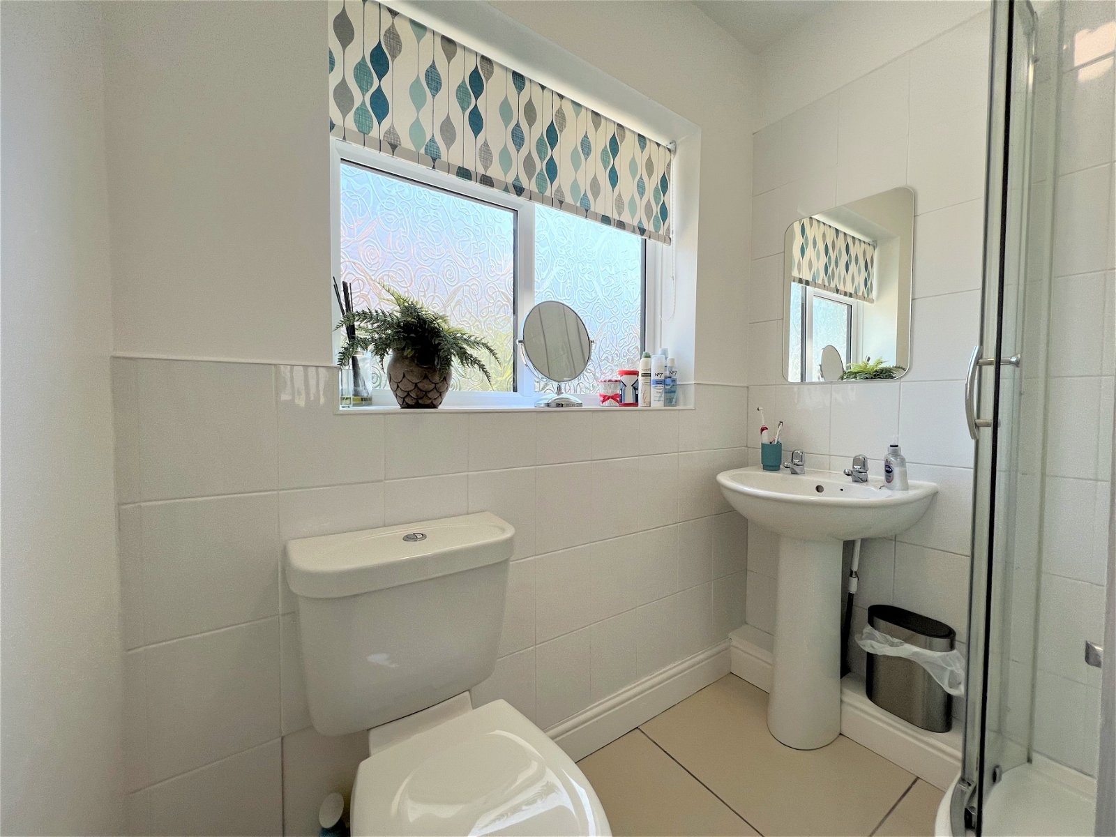 Featuring a three piece suite finished in white, comprising a corner shower unit, a pedestal wash hand basin and a low flush W.C. The room has partial tiling to the walls, full tiling to the floor, a rear facing obscure double glazed window, a chrome towel radiator and a single spot light to the ceiling.