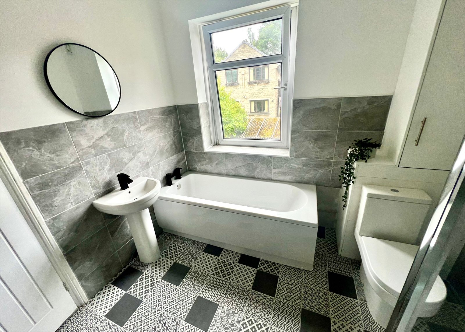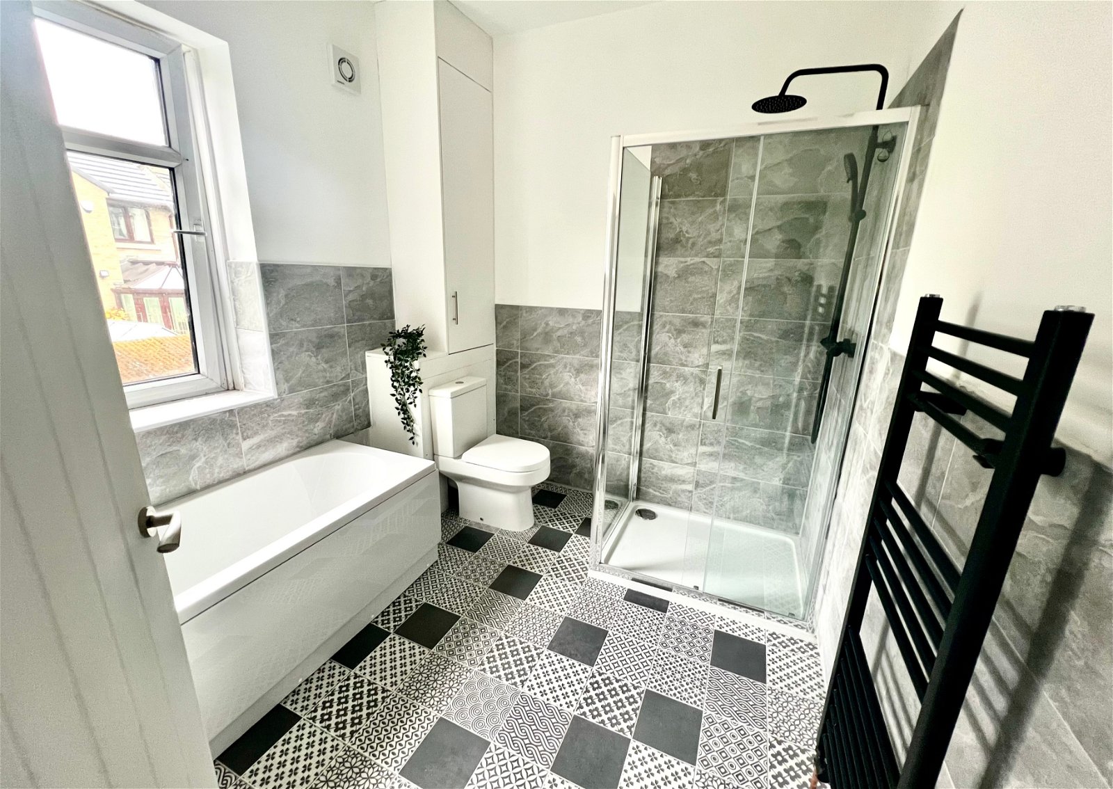 A spacious room presented with a modern four piece suite comprising a low flush W.C, a pedestal wash hand basin, a shower and a bath with a tiled surround. The room has feature tiling to the walls, a radiator, a double glazed window and a fitted cupboard which is home to the boiler.