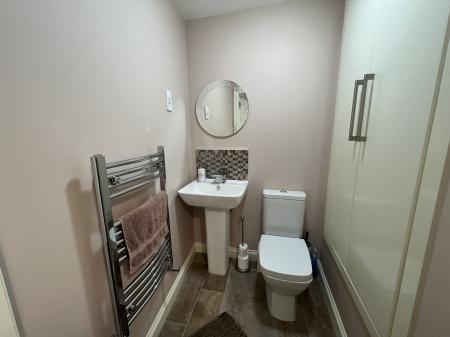 CLOAKROOM Presented with a two piece suite finished in white, comprising a low flush W.C and a pedestal wash hand basin with a tiled splash back. There is full tiling to the floor, a useful storage cupboard, spot lighting to the ceiling, an extraction unit and a chrome towel radiator.