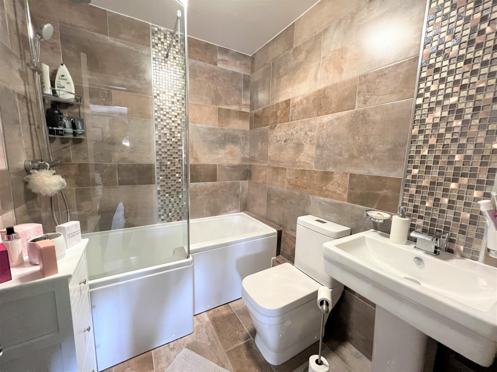 FAMILY BATHROOM Featuring a three piece suite finished in white, comprising a panelled P bath with a shower over and a fixed glass screen, a low flush W.C and a pedestal wash hand basin. The room has full tiling to the walls and floor, a single spot light to the ceiling, a chrome towel radiator and an extraction unit.