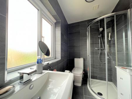 EN-SUITE Presented with a three piece suite finished in white, featuring a walk-in corner shower, a low flush W.C. and a wash hand basin with a vanity unit beneath. There is full tiling to the walls and floor, an obscure rear facing double glazed window, a single spot light to the ceiling and a chrome towel radiator.