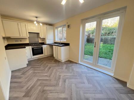 Inside, you’re greeted by a bright entrance porch leading to a spacious living room, perfect for relaxing or entertaining. Large windows create an airy atmosphere, and the layout flows seamlessly into a stylish, well-equipped dining kitchen, featuring modern units, ample counter space, and direct access to the rear garden — ideal for family meals or summer gatherings.