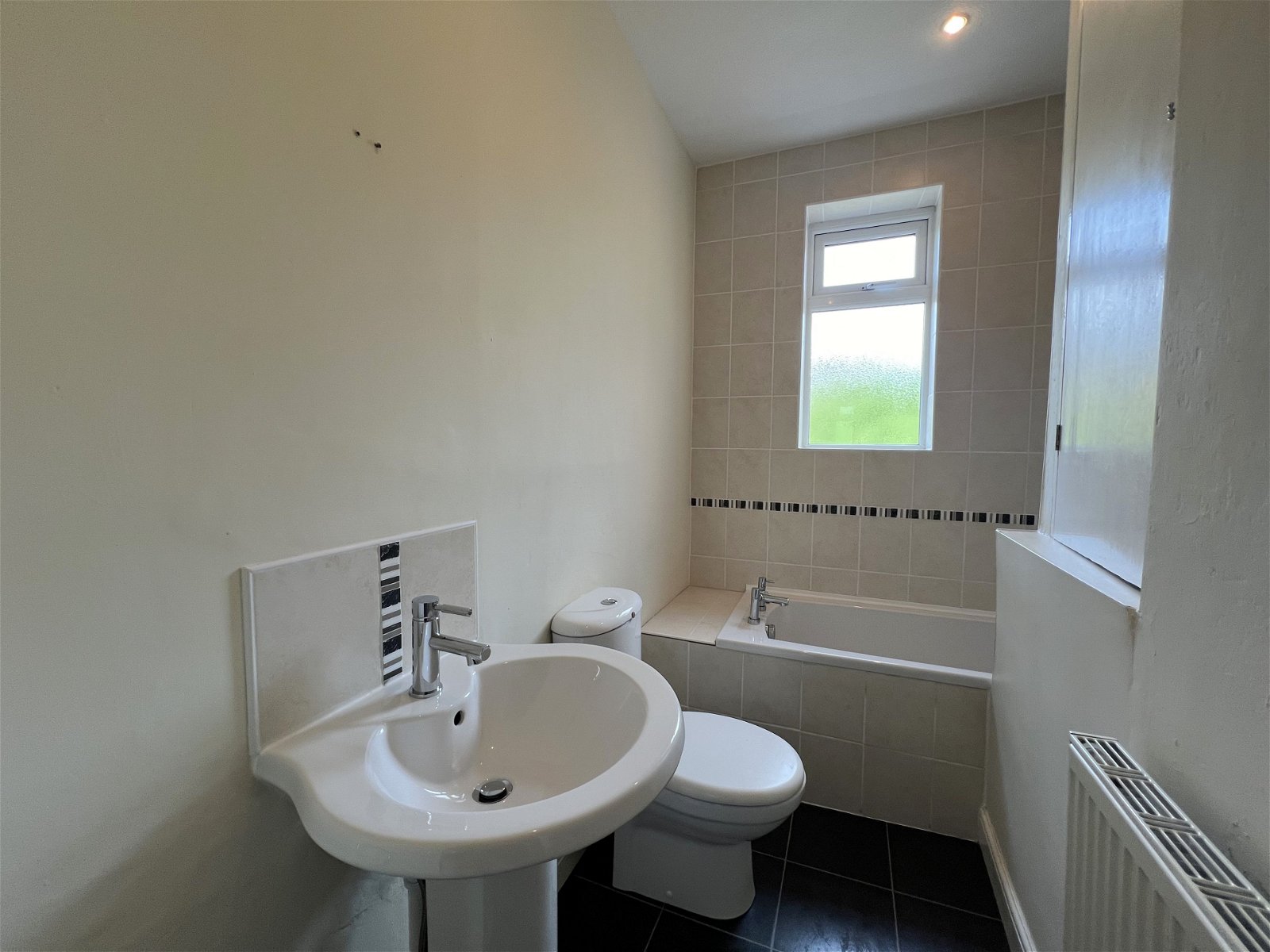 Featuring a three piece suite finished in white, comprising a bath with a shower over, a low flush W.C. and a pedestal wash hand basin. The room has a rear facing double glazed window, partial tiling to the walls, spot lights to the ceiling and a central heating radiator. There is a useful storage cupboard over the stairs.