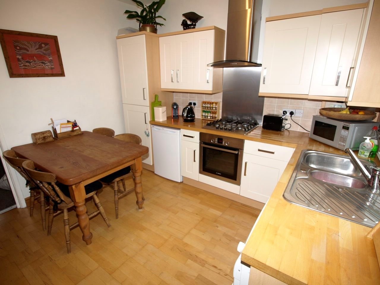 A well proportioned room having a rear facing double glazed window and a Upvc entrance door which opens into the rear yard. The kitchen is presented with a range of modern white wall and base units, with a complimentary work surface, which in turn incorporates a one and a half bowl Stainless steel sink and drainer unit with a mixer tap over. Appliances include a four-ring Bosch gas hob with an extraction unit over and an electric oven beneath. The room has partial tiling to the walls, under counter plumbing for an automatic washing machine and space for a fridge/freezer. There is a useful under stairs storage cupboard and the central heating boiler is housed in the kitchen. Stairs rise to the first floor landing.