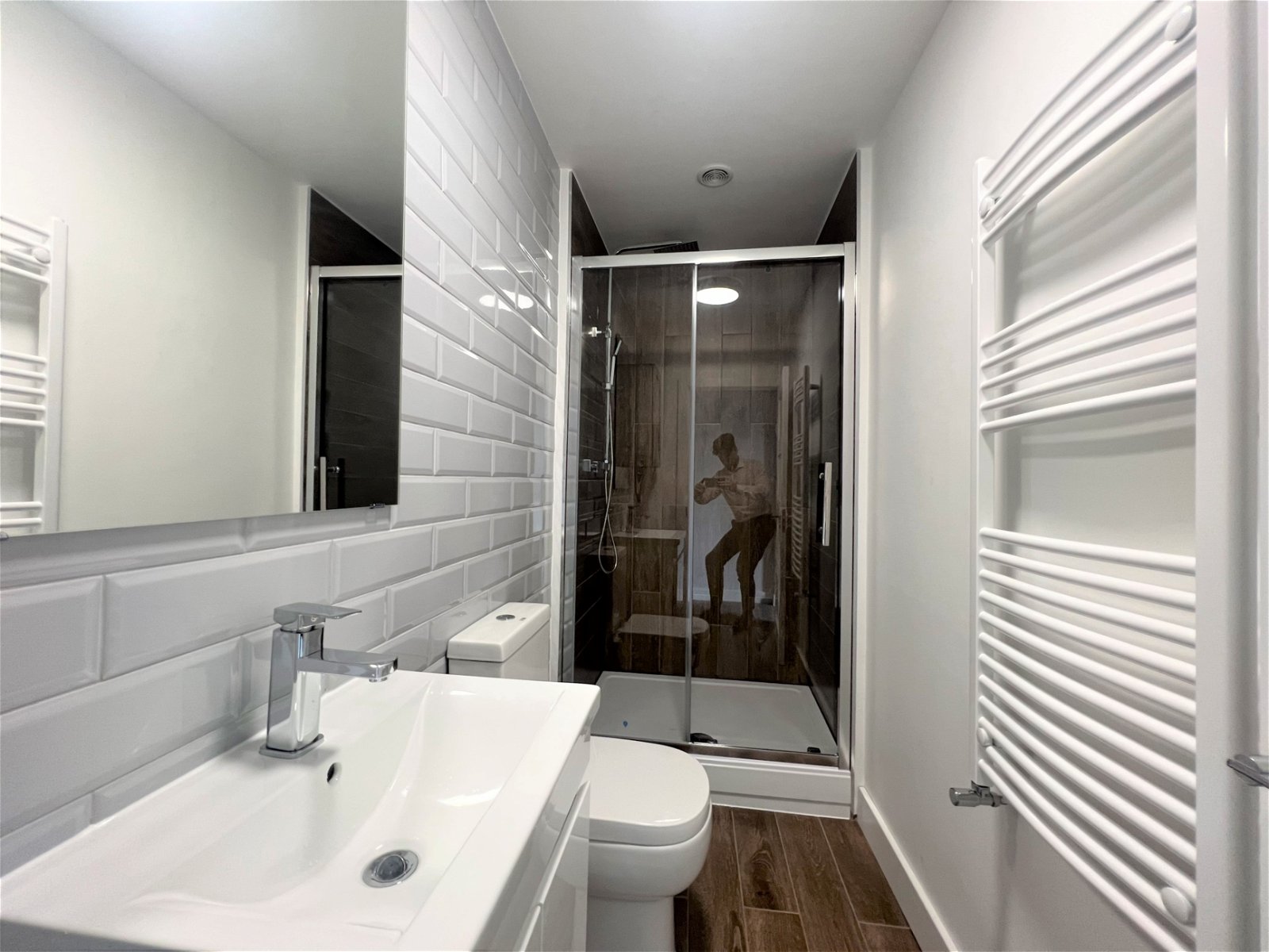 Presented with a stunning three piece suite finished in white, comprising a large step in shower, a low flush W.C and a wash hand basin set to a vanity unit. The room has partial tiling to the walls, a spot light to the ceiling and a vertical towel radiator.