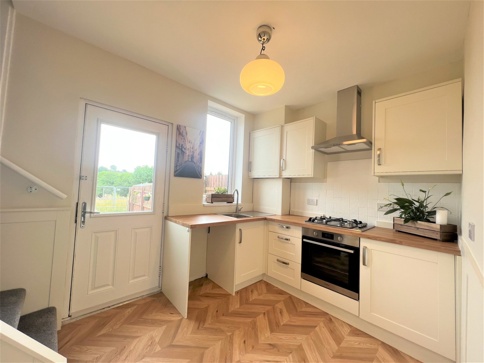 Featuring a newly installed range of wall and base units, with a complimentary work surface, which in turn incorporates a Stainless-steel sink and drainer unit with a mixer tap over. There is a four ring gas hob with an extraction unit over and a an integrated electric fan oven beneath. The room has plumbing for an under counter washing machine and the central heating boiler is housed in the kitchen. The kitchen has a Upvc entrance door opening directly to the rea garden, a double glazed window and a central heating radiator. Access is gained to the cellar and stair rise to the first floor landing.