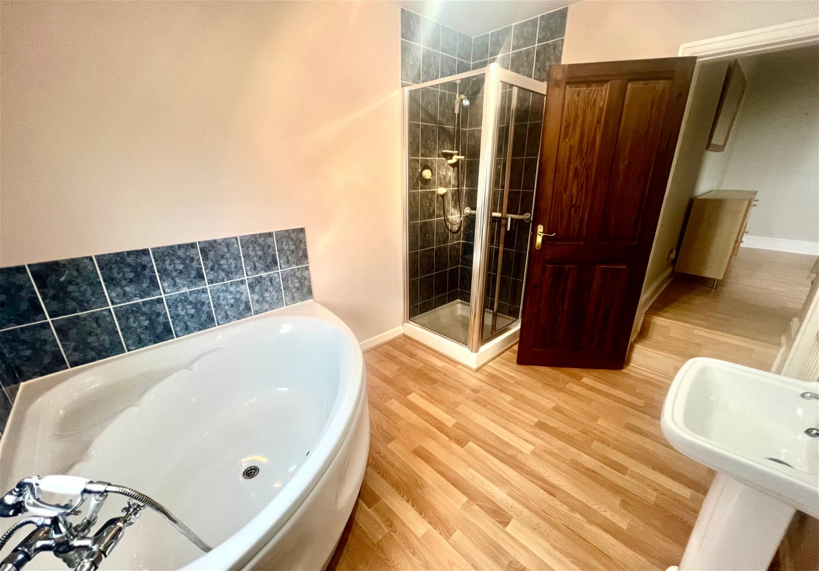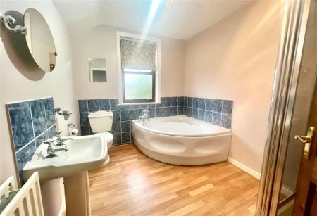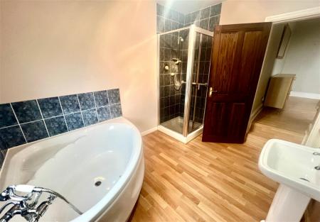 The bathroom is presented with four-piece suite, comprising a step-in shower a corner panelled bath, a low flush W.C. and a pedestal wash hand basin.