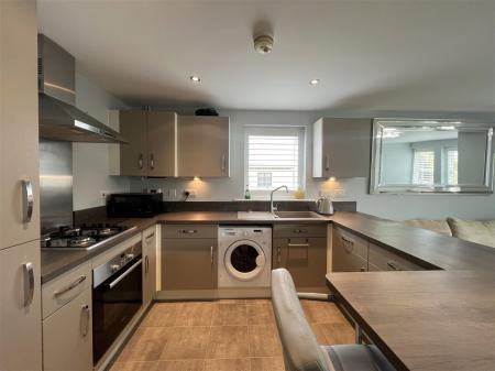 A spacious, modern open plan living kitchen area, having dual aspect double glazed windows to the front and side aspect flooding the room with natural light and two central heating radiators. The kitchen is presented with a range of modern grey wall and base units, with a complimentary roll edge work surface which extends to a two seat breakfast bar, which in turn incorporates a Blanco sink and drainer unit with a mixer tap over. A complement of appliances includes a Bosch four-ring gas hob, with a Bosch electric oven beneath, a Stainless steel splash back with an extractor unit over, an integrated fridge and freezer and an integrated washing machine. The kitchen area benefits from spot lights to the ceiling, with a pendant light to the living space.