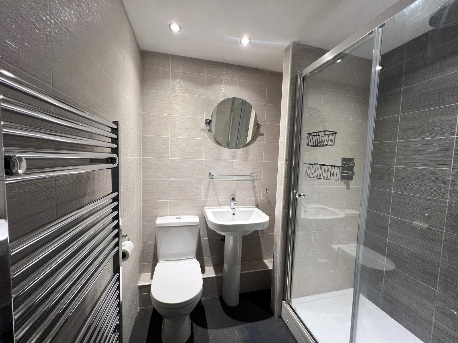 Featuring a large step-in shower, a low flush W.C. and a pedestal wash hand basin. The room has full tiling to the walls and floor, spot lights to the ceiling, an extraction unit to the ceiling and a chrome towel radiator.