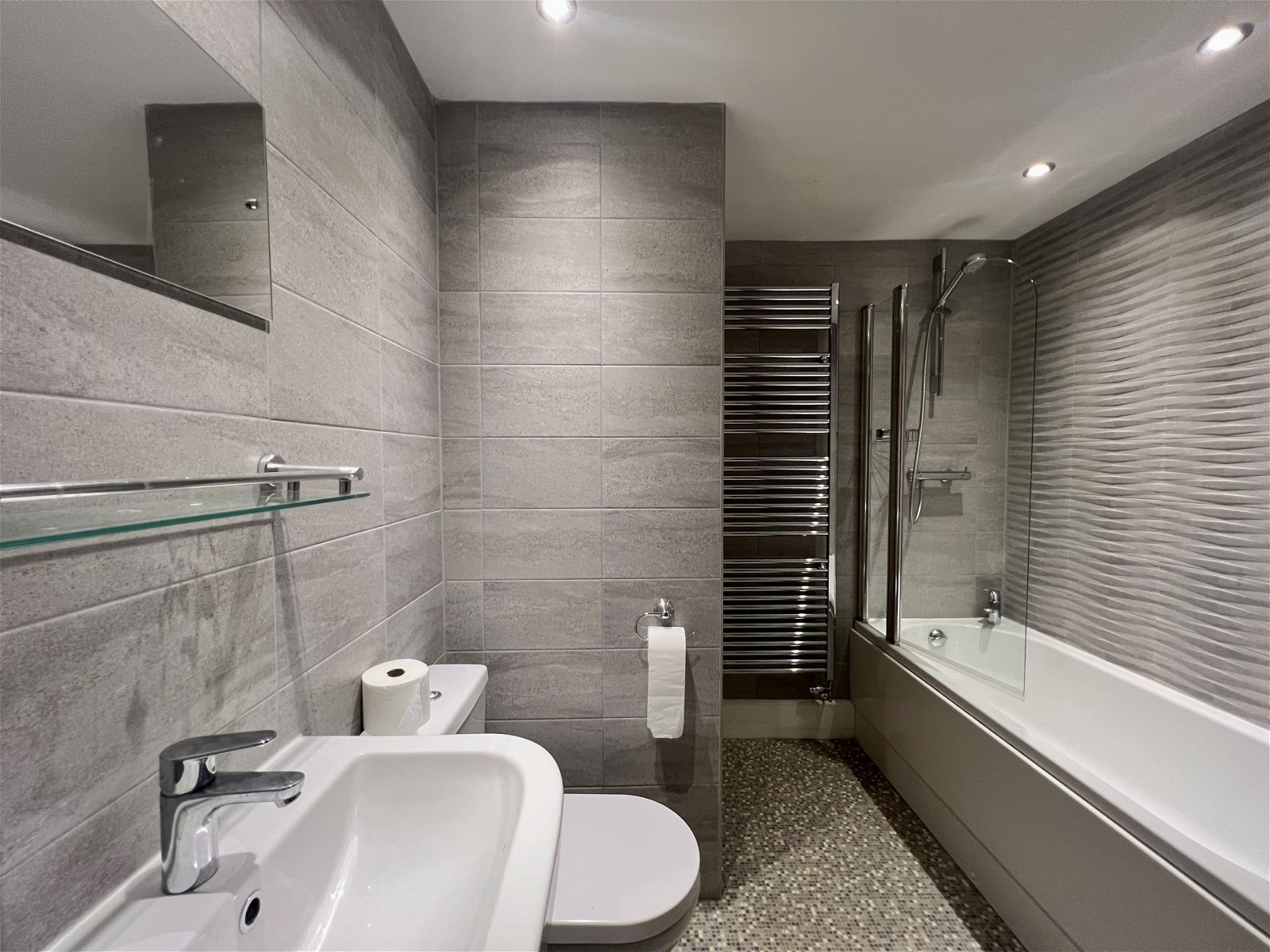 Presented with a modern three-piece suite finished in white, comprising a panelled bath with a shower over, a low flush W.C. and a pedestal wash hand basin. The room has full modern tiles to the walls, full tiling to the floor, a large chrome towel radiator, spot lights to the ceiling and an extraction unit to the ceiling. There is also a useful airing cupboard which houses the hot water cylinder tank.