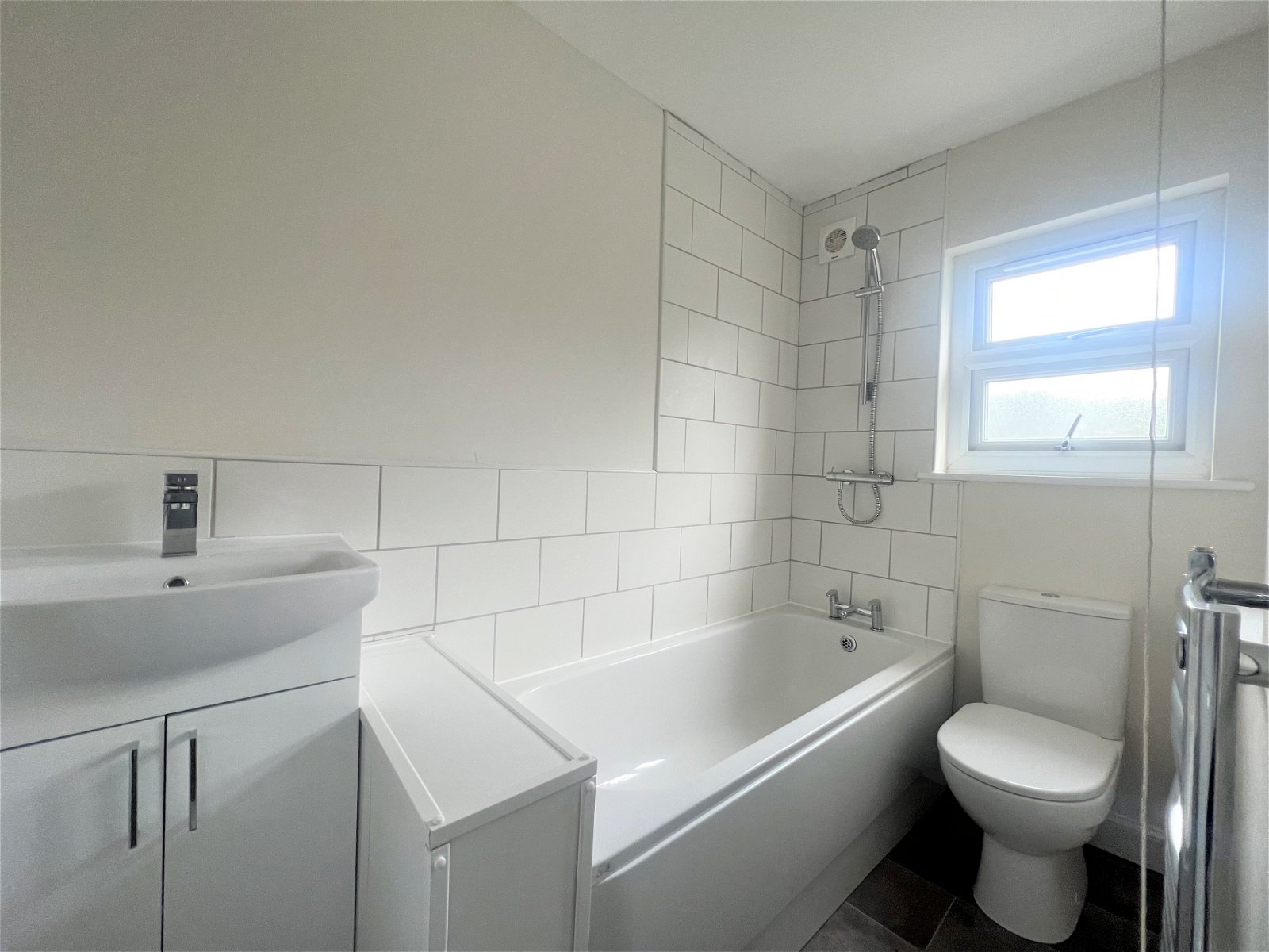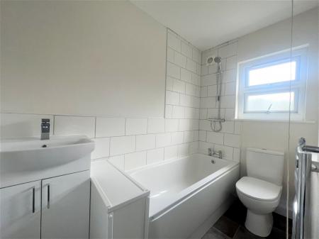 Presented with a three piece suite finished in white, comprising a panelled bath with a shower over, a low flush W.C. and a wash hand basin set to a vanity unit. The room has partial tiling to the walls, a rear facing obscure double glazed window and a chrome towel radiator. There is a useful over stairs storage cupboard.