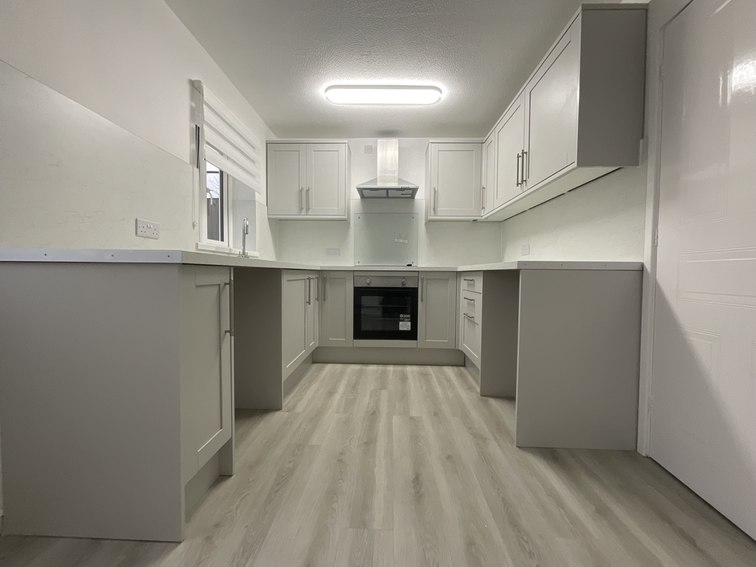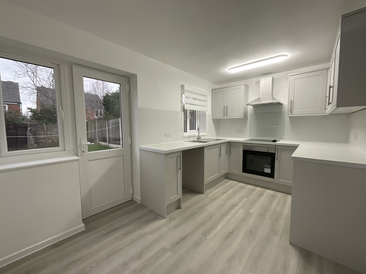- Newly fitted kitchen with an integrated electric hob, extractor hood, space for a washing machine and under counter fridge