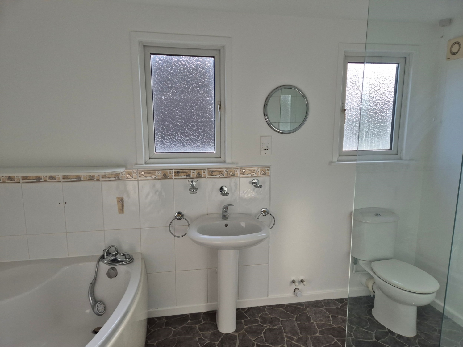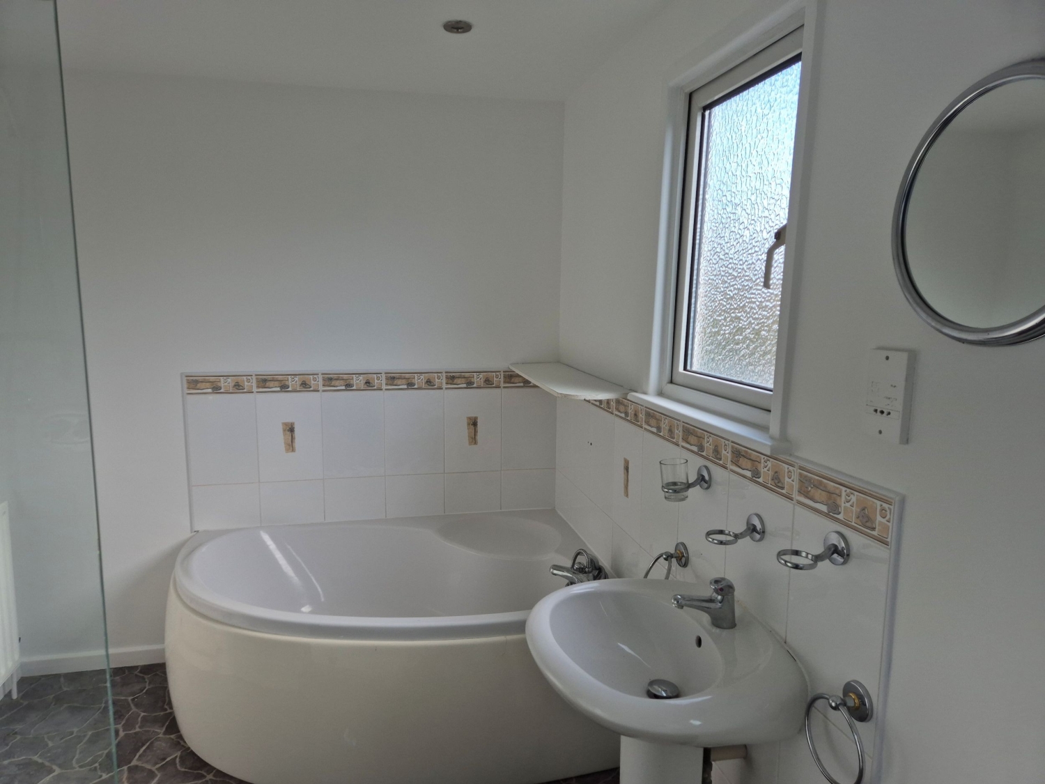 - Family bathroom with corner bath and separate double walk in shower cubicle with mains shower