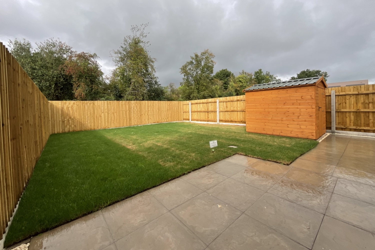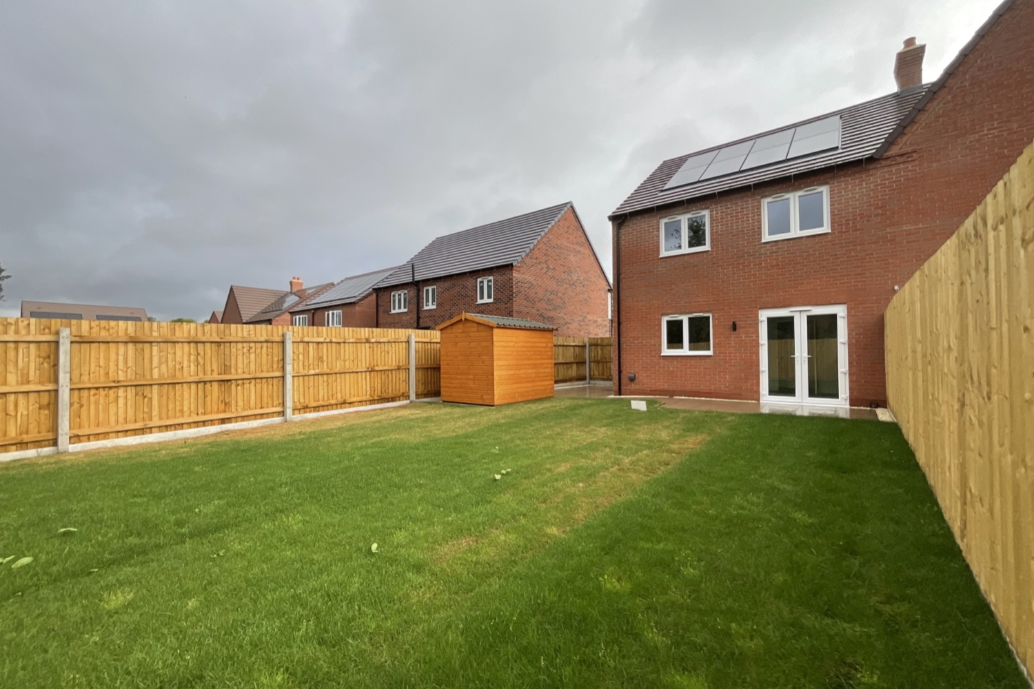 - Front and rear gardens with garden shed and patio area.