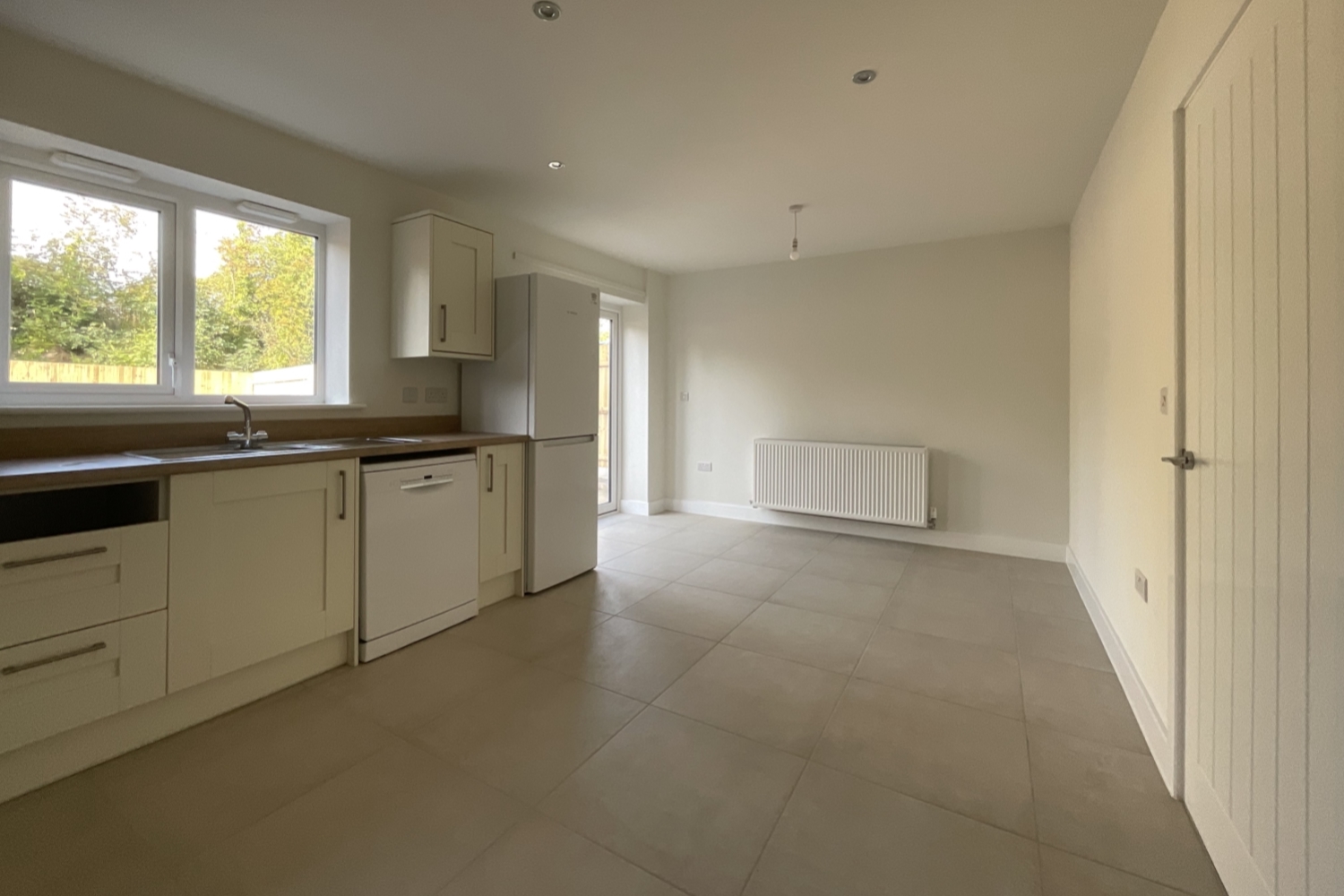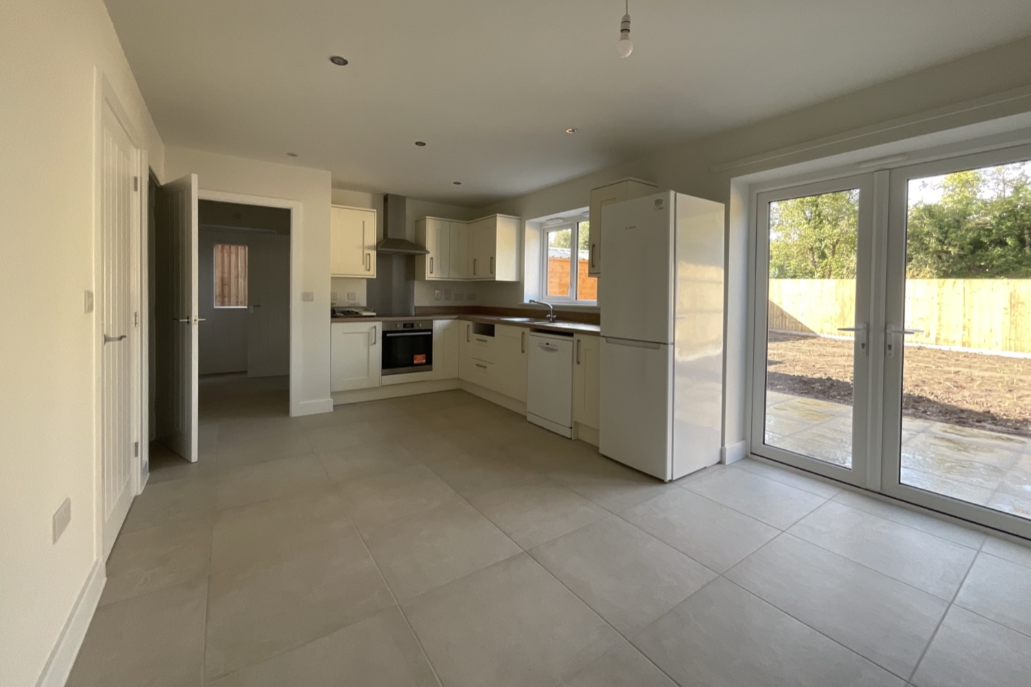 - Kitchen/dining room with french doors leading to garden and appliances; integrated electric oven, ceramic hob, extractor hood.