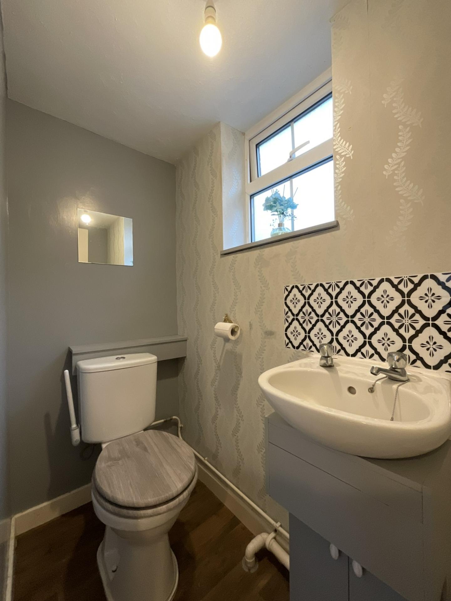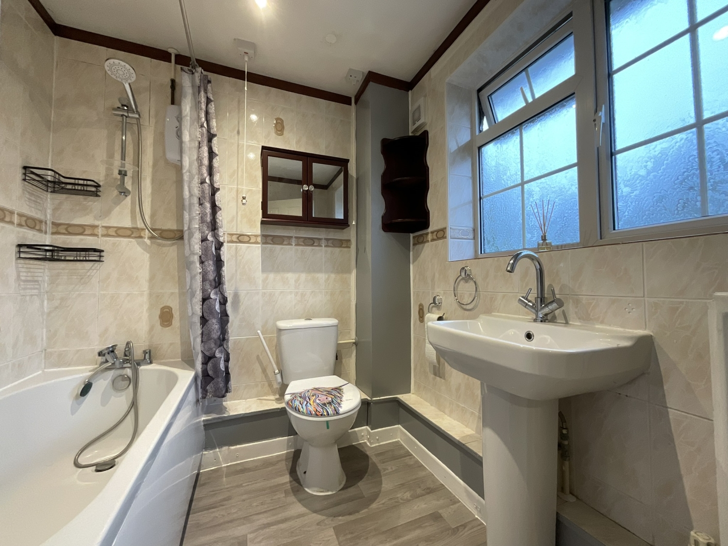 - Bathroom with electric shower over bath