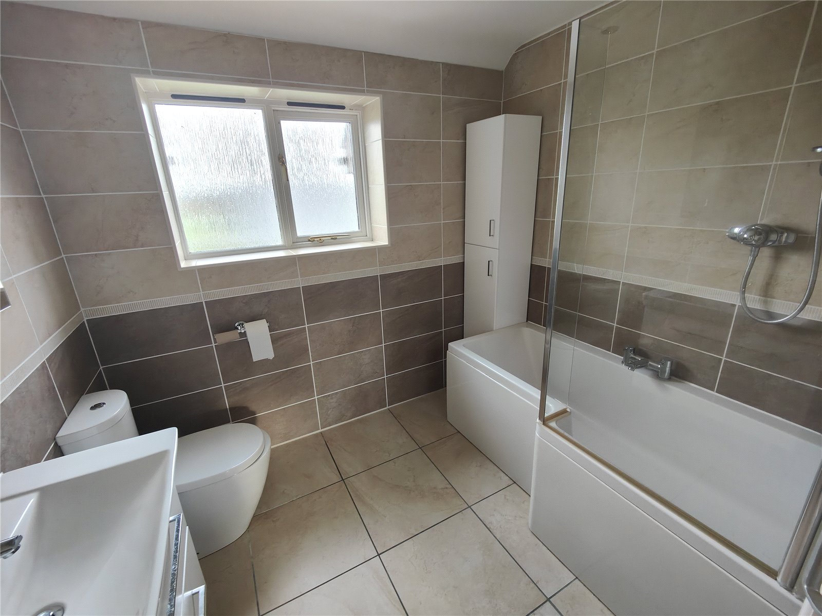 En suite Bathroom with L- shaped bath with thermostatic shower and mixer tap, w.c and wash basin.