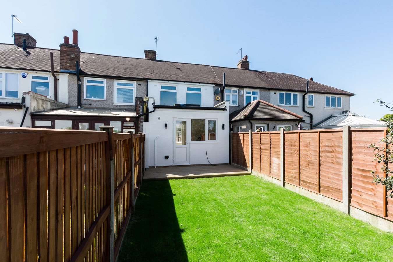 The rear garden has been landscaped with a new decked patio and lawn with high fence panels either side and a gated rear service road that backs onto allotments.