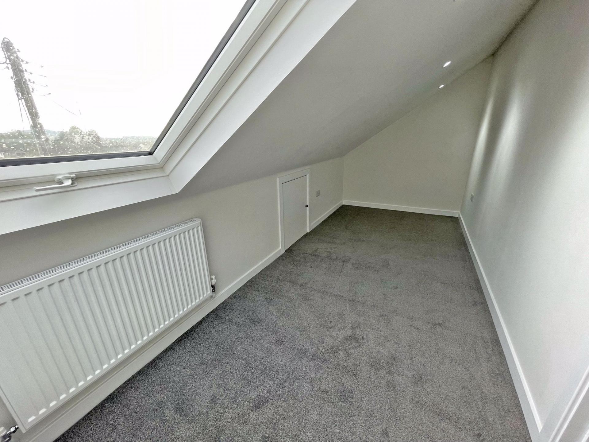 A Modernised, converted top floor flat. Beautifully presented with modern contemporary finish throughout. Communal entrance hall and stairs, fire alarm system. Entrance hall, open plan Sitting room and Kitchen (with some appliances) / Diner with dormer window and velux windows. Spacious master bedroom, bedroom 2 / home office, large bathroom with bath and separate shower, Neutral decor, laminate, carpet and tile floorings, Gas CH, double glazed windows, single parking space and enclosed garden laid to lawn. UNFURNISHED. EPC: C-79