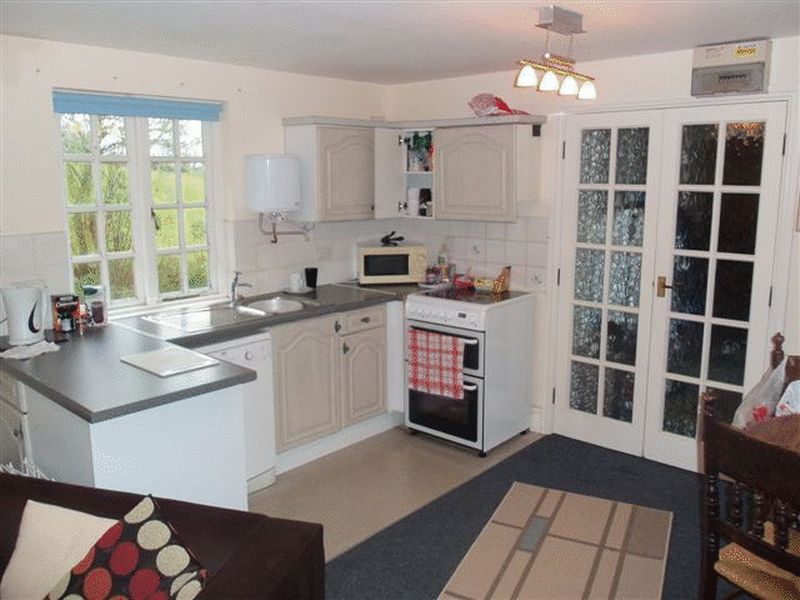 (Overall dimensions) 5.67m (18'07") x 3.71m (12'02") This main room enjoys a triple aspect, with an outlook over the rear garden and the open farmland. The sitting room area has two windows, there are curtains, an electric panel heater, a TV point, carpet, a corner wall cabinet with a glazed door and a BT point. To the kitchen/dining area the kitchen comprises a range of floor standing and wall mounted cupboards, co-ordinated worksurfaces with a tiled splashback, a stainless steel single drainer sink, a Heatrae Sadia Express hot water heater, an under counter fridge, a freestanding dishwasher and a freestanding electric double oven with electric hob. There is vinyl flooring to the kitchen. To the dining area there is a window, curtains, carpet, a further electric panel heater and an RCD protected fuse board.