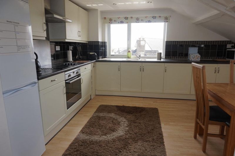 4.0m (13') x 3.3m (10'9") Sloping ceilings. Window overlooking the High Street. uPVC double glazed window which enjoys a pleasant southerly aspect and has an outlook over Sidmouth High Street to the sea beyond. An attractive fully fitted which comprises a range of floor standing and wall mounted cupboards with cream drawer and door fronts, stainless steel handles, slate coloured worksurfaces, black tiled splashbacks and a stainless steel one and a half bowl sink with drainer. Stainless steel single electric oven and electric hob with stainless steel splashback and stainless steel chimney extractor over. Freestanding fridge/freezer. Laminate floor covering. Ceiling spotlights. Roller blinds to the windows. Thermostatically controlled radiator.