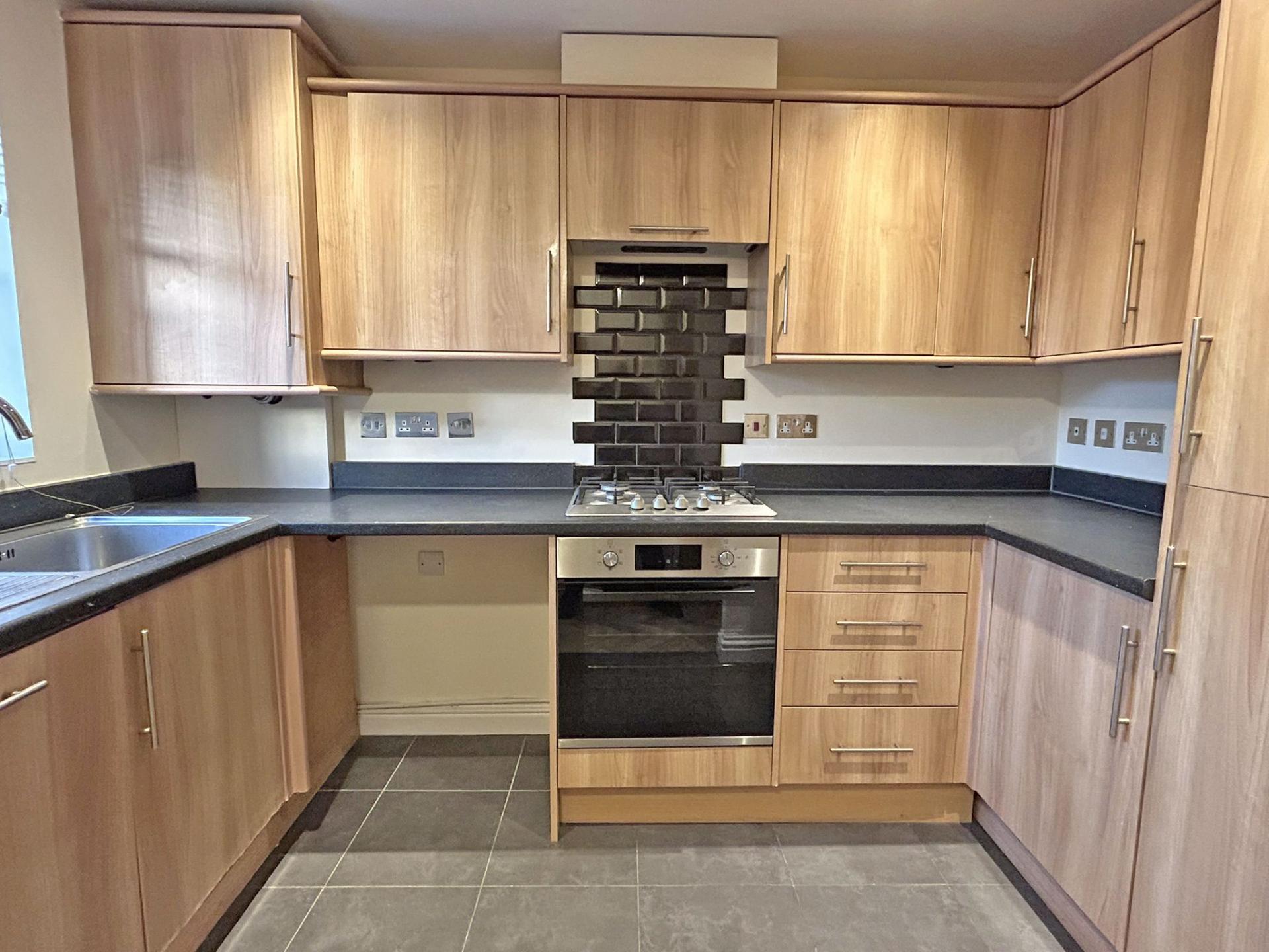 3.08m (10’1) x 1.85m (6’) uPVC double glazed window to the front aspect. Fitted blind. Fitted kitchen comprising a range of floor standing and wall mount cupboards with dark wood colour drawer and door fronts. Black worksurfaces. Stainless steel sink incorporating draining unit. Built in electric single oven, gas hob with tiled splashback and cooker hood over. Integrated fridge/freezer and dish washer. Space for a freestanding washing machine. LED downlights. Tiled floor covering. Wall hung gas fired combination boiler.