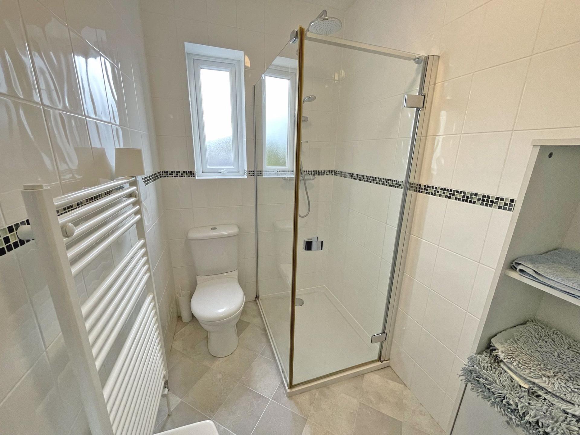 A modern white suite with fully tiled walls, which incorporates a wash basin with a vanity cupboard under, WC and a large shower cubicle with a hinged door, fully glazed with a Mira shower with a shower attachment and fixed rain-style head. Fully tiled walls from floor to ceiling with white tiling and glass mosaic border tile. Tile effect lino floor covering. Heated towel rail. Mirror fronted bathroom cabinet with lights and shaver point over. uPVC obscure glazed window. Ceiling extractor.
